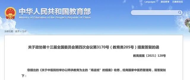 教育部强调,中医师承教育是保证中医药学术与临床经验传承的最重要途径。下一步,教育部将会同国家中医药管理局继续深入贯彻落实《国务院办公厅关于加快医学教育创新发展的指导意见》(国办发〔2020〕34号),扎实推进《教育部 国家卫生健康委 国家中医药管理局关于深化医教协同进一步推动中医药教育改革和高质量发展的实施意见》(教高〔2020〕6号),鼓励有条件的中医药院校开设中医师承班,支持中医药院校推进师承教育与院校教育、毕业后教育、继续教育相结合的人才培养模式改革,提高中医药人才培养质量,为我国中医药事业传承创新发展和健康中国建设提供坚实的人才支撑。