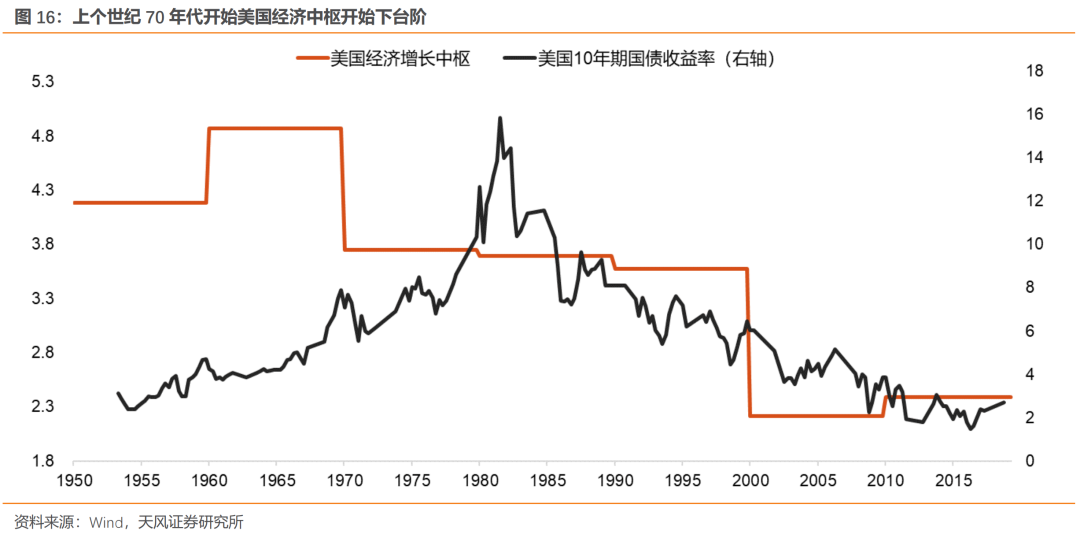 日本科技与消费行业走强背后同样是来自于产业结构转型的支撑。日本方面战后主导产业变迁经历:①经济恢复阶段(46-60年):能源部门;②高速增长阶段(60-73年):重化工业;③稳定增长与泡沫阶段(73-90年):消费业及精密制造业;④泡沫崩溃与恢复阶段(90年至今):消费服务业及精密电子与材料等。1990年代开始,随着泡沫经济的崩溃,日本经济陷入长期衰退,经济增长中枢出现大幅下台阶,甚至一度出现负增长,国债收益率也相应进入中枢下移阶段。