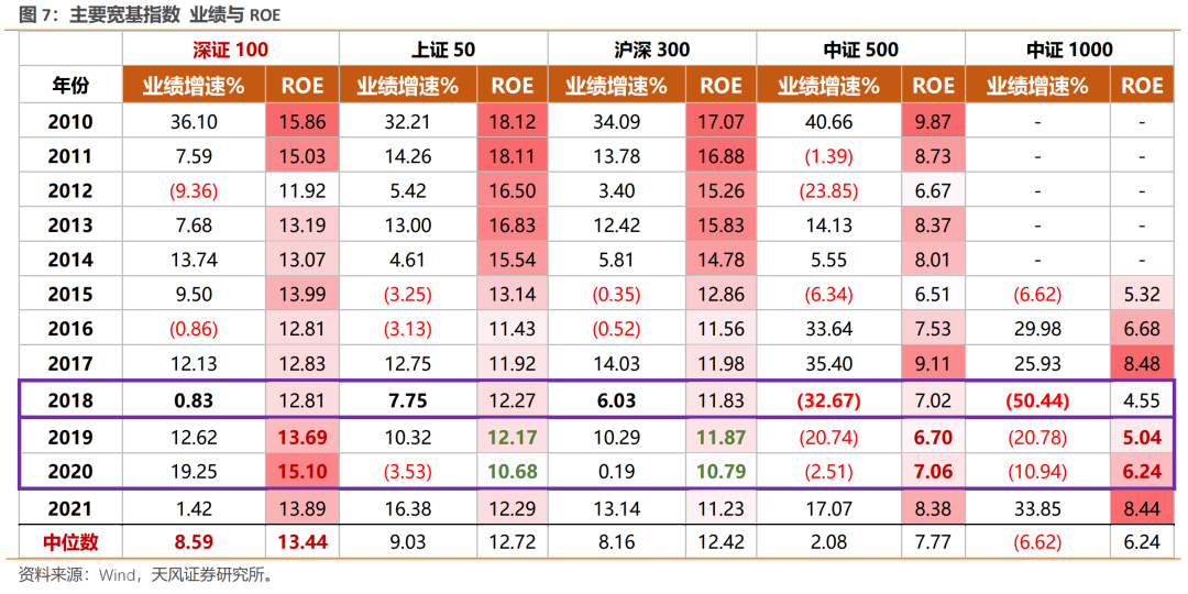 (1)成长的担忧来自产业周期下行、业绩降速,对此:指数的价值成分能抬高ROE中枢水平,用稳定的盈利能力部分对冲负面宏观因素冲击、产业周期下行等因素导致的成长业绩调整,如2018年未大幅受商誉减值冲击,而其他成长指数业绩均塌方。对应地,深证100长期业绩增速中枢高于中证500、中证1000。