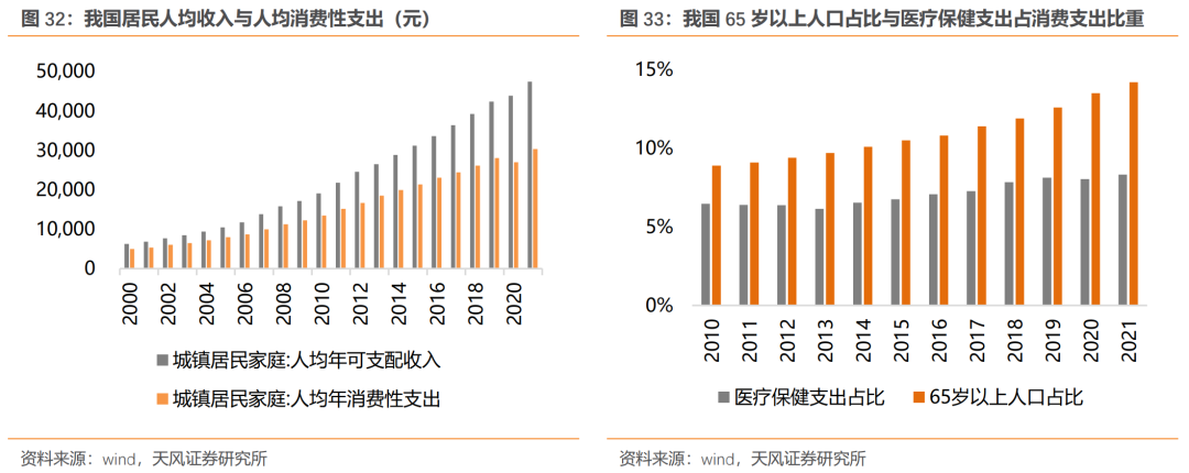 第三,消费升级与人口老龄化趋势,可能长期支撑消费与医药。一方面,近几年在经济保持中等增速的背景下,人均可支配收入不断提升,人均消费支出也在近十年保持7%-10%左右的增速,这些为消费升级奠定了重要的基础,传统的食品饮料等方向的消费升级是大势所趋。另一方面,在人口老龄化不断加剧的背景下,居民医疗保健支出占比持续提升,从10年的6%附近上升至21年的8%附近。我们认为,随着人口老龄化的加速,未来医疗保健支出占比或将进一步提升。