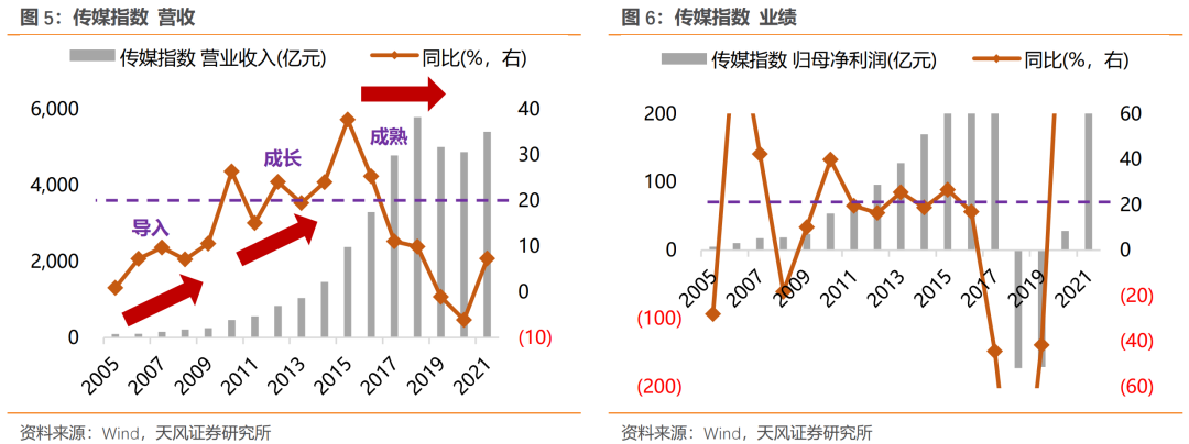 以传媒板块为例,参考我们的历史报告《创业板指10年复盘:以成长性为锚,穿越宏观周期》,2009年前后、3G产业周期兴起,传媒板块进入快速成长期、营收保持高增长,15-16年前后随移动互联网红利兑现完毕等进入成熟期,随后营收进入16-17年低速增长期,如果不考虑政策面的外生性因素,此阶段行业短期呈现出收入利润剪刀差小幅扩张、营收增速和业绩增速趋于稳定增长的价值属性。后续,监管连续收紧(移动游戏版号、网剧监管、影视税收等),影响行业逻辑,政策紧缩周期带动产业周期下行,价值属性受破坏,传媒从前5大行业移出。