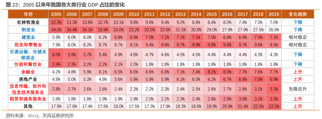 从产业结构的转型方向来看,我国基本延续了美日产业结构转型的路径,经济发展的主要动力逐渐从传统制造业转向新兴产业和消费服务类行业,科技与消费行业在GDP中占比不断提升,而传统行业占比则逐步回落。从宏观产业结构的变化来看:2005年以来,我国宏观产业占比趋势性提升的行业包括:金融业、房地产行业、信息传输/软件和信息技术服务业、租赁和商务服务业、批发零售业,而传统制造业、农林牧渔等行业的占比则明显下降。