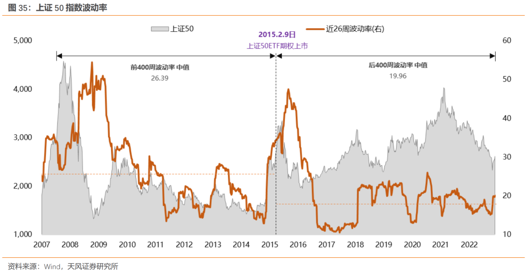 期权上市在即,有望进一步平滑深证100波动。近日,证监会宣布启动深证100ETF期权上市工作,境内首只面向创新蓝筹股票的期权品种平稳推出在即,与已有上市品种差异显著,形成良好互补。复盘显示,期权的推出对现货价格波动通常有一定平抑作用,以上证50ETF期权为例,推出后400周波动率中位数较推出前下降24%。因此,除成长与价值并济构建稳健的基本盘之外,未来随着期权的推出,深证100指数对于长期投资的稳定性优势也有望得到强化。