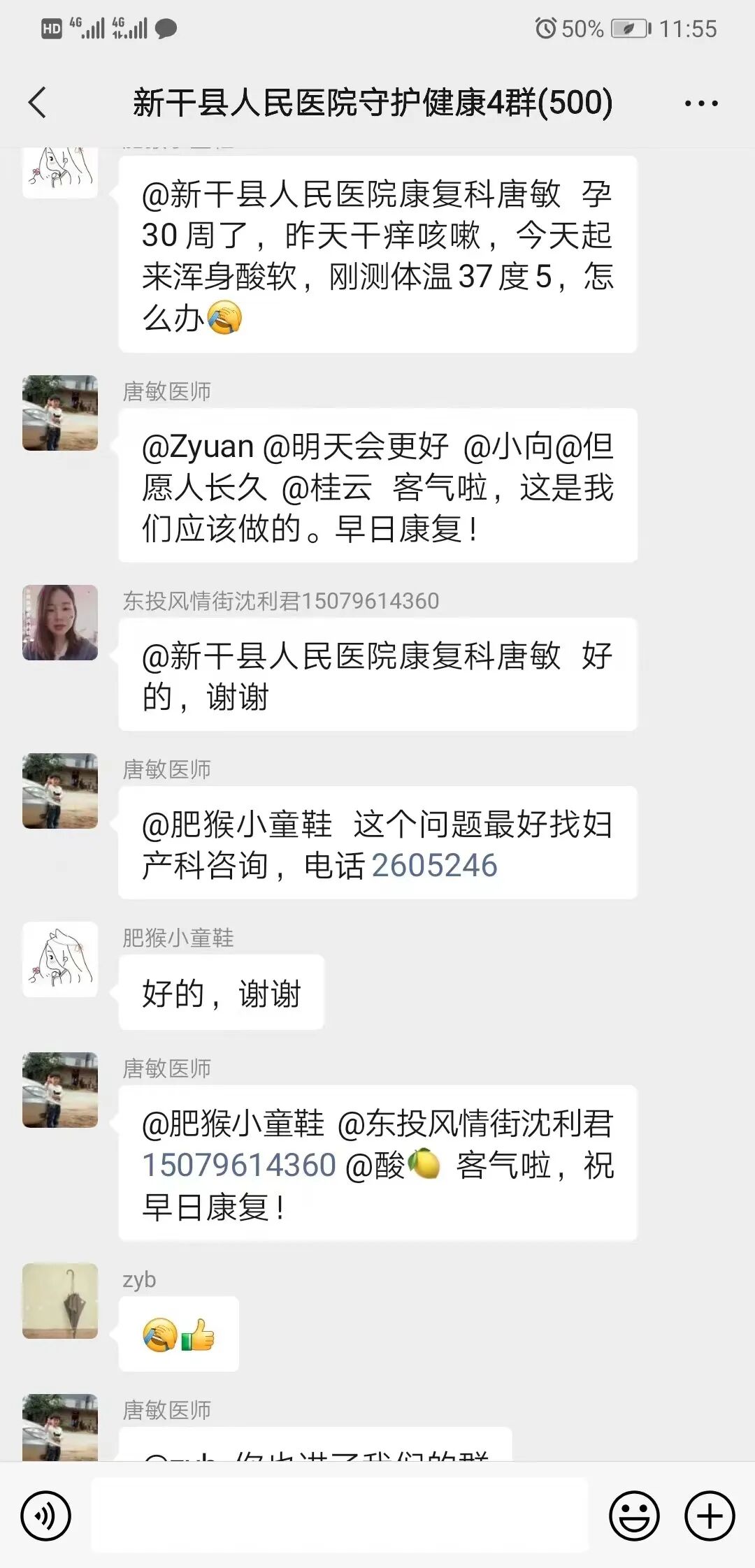 近期我县本地疫情出现高峰,严重影响了群众日常的就医需求,为解决这一困难、助力各项管控措施落地,在这场没有硝烟的“战争”中,新干县人民医院健康管理医学科副主任黄文军有了一个想法,那就是利用自己职业的优势,以互联网的形式去帮助更多有就医需求的群众。心动不如行动,黄文军立马就联系了康复医学科唐敏副主任、骨科史超副主任,三个人发挥集体智慧,决定为群众组建一个“新冠宣教志愿者群”,并在微信群里安排了15名医务志愿者24小时在线轮值回答群众的各种困惑,解决百姓就医燃眉之急。