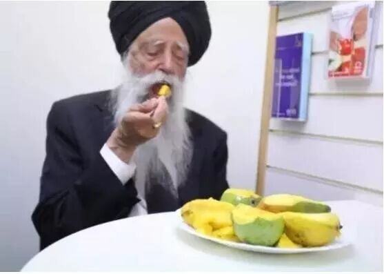 我希望能够激励大家去吃健康的、以植物为主的食品。我不能左右大家的饮食习惯,但我想与乐于倾听的朋友们分享素食的好处。我这辈子大多数时间都在吃素。在锡克区,我们吃饭是为了活着,但活着不是为了吃饭。在我的故乡旁遮普,这块印度的绿带上,很多人都吃自己种的食物--我之所以长寿在很大程度上是因为旁遮普的素食,比如薄饼、豆子、辣味炒拌菜和菠菜。“我的食谱包括木豆、绿色蔬菜,不吃其他任何油炸食品,喝开水和茶时都会放上姜片。我每天都很早睡觉,脑子从不想那些消极的事情。”谈到自己的养生秘诀时,辛格总结为戒烟、戒酒和吃素食。
