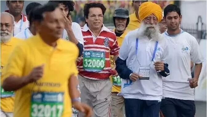 百岁素食老人福贾·辛格(Fauja Singh),当今世界上最长寿的马拉松选手,百岁年龄组马拉松世界冠军,世界纪录保持者,吉尼斯世界纪录全球第1人。因为总是戴着印度式头巾比赛,人们送给他一个“头巾旋风”绰号。