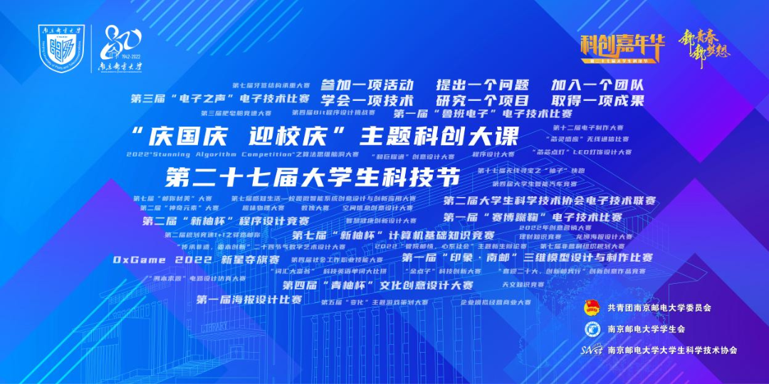 为了庆祝祖国73周年华诞,喜迎南邮办学80周年校庆,校大学生科协举办了科技节开幕式,在国庆期间为全校师生奉献一堂“科创大课”。本次活动创新点在于集字盖章运用了南邮的“红、绿、蓝”三色。我们在现场摆出了很多科创成果和科技发明,希望能提升同学们在科创展览活动中的互动感和体验感。今年科技节的比赛也比往年有所增多,比赛主题也有所创新,并为22级新生设定了专属赛道。希望大家能切身体会到南邮的科创成果和良好氛围,为南邮的科技创新贡献自己的一份力量。