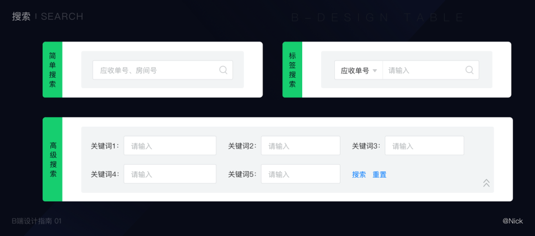 在样式上,搜索可以分为简单搜索、标签搜索、高级搜索等三类。- 简单搜索:由一个搜索框和一个按钮组成,可以输入一个或多个条件进行搜索。