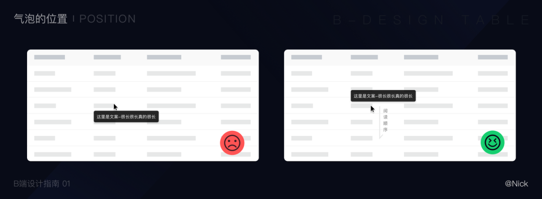 当列表中数据过长时,我们需要根据屏幕宽度调整列表展示方式,超过列表默认宽度的内容可以省略,通常用“…”表示,鼠标移入后出现气泡展示全部内容。位置:建议展示在上方,因为我们的阅读顺序是从上到下,鼠标向下移动时不会被上面的气泡遮挡住。气泡面积不宜过大,根据屏幕尺寸控制在一定比例,一版不超过内容区的四分之一,展示不下的内容可以在气泡中增加滚动条。![]()