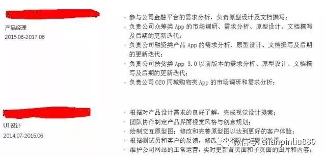 作为一个产品面试官,我在筛选简历的时候就可以很快的知道简历2同学是没有太多参与产品经理工作的,在简历介绍上他只是生搬硬套把PM的工作职责描述出来