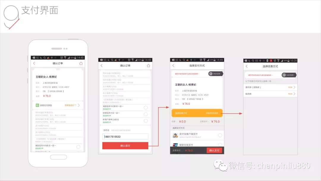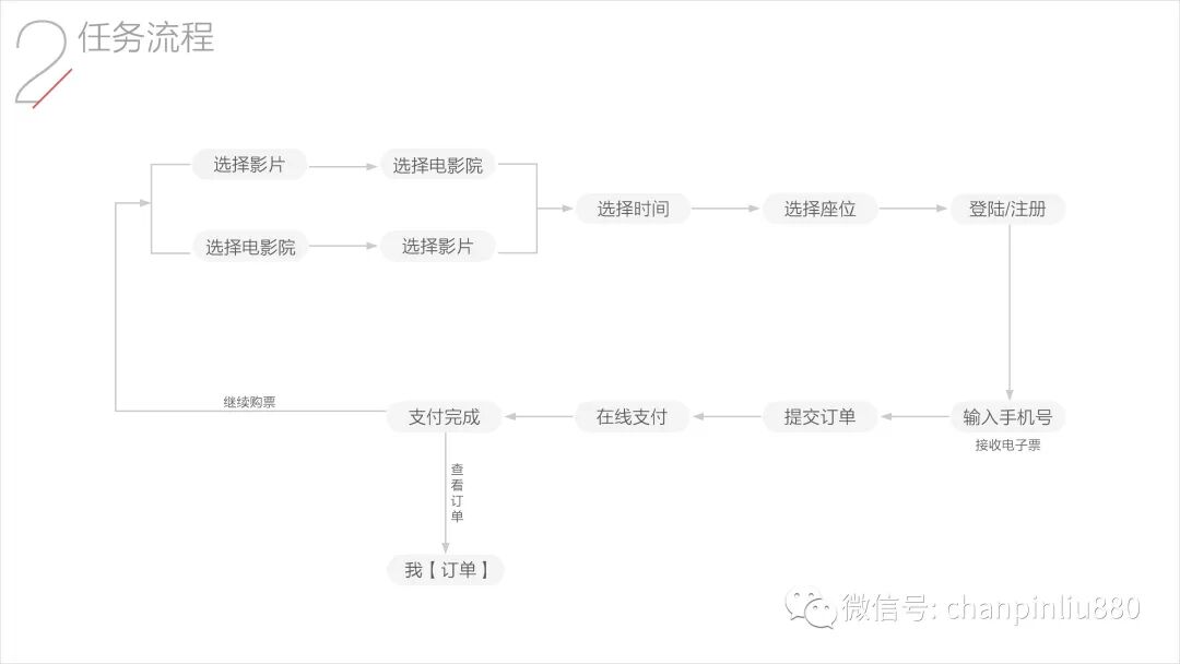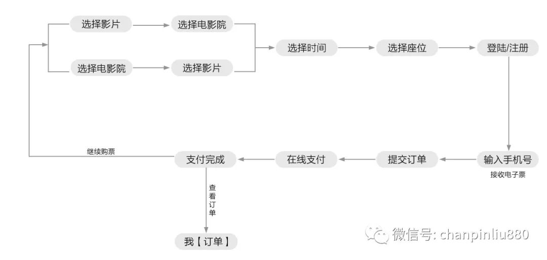 在进行产品体验分析之前,如果把产品的所有功能和页面都拿来比较分析,很难做到深入细致的,大而全则容易肤浅。所以刚开始尽量从主流程入手,如蜘蛛网电影票的核心业务是购票流程,那么我从这个流程着手(流程图如下),以成功购买电影票为线索进行流程操作体验,这样思路会较为清晰,以能用→易用→好用为准则,把涉及到的功能和界面进行交互方式和视觉表现层面上的对比分析,目的在于得出自己的改进建议,并给出理由。这样才能更有效更深入,不至于泛泛而谈。
