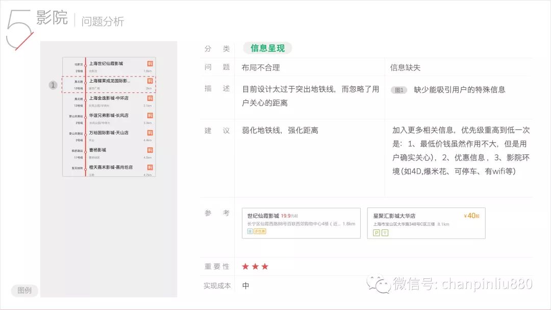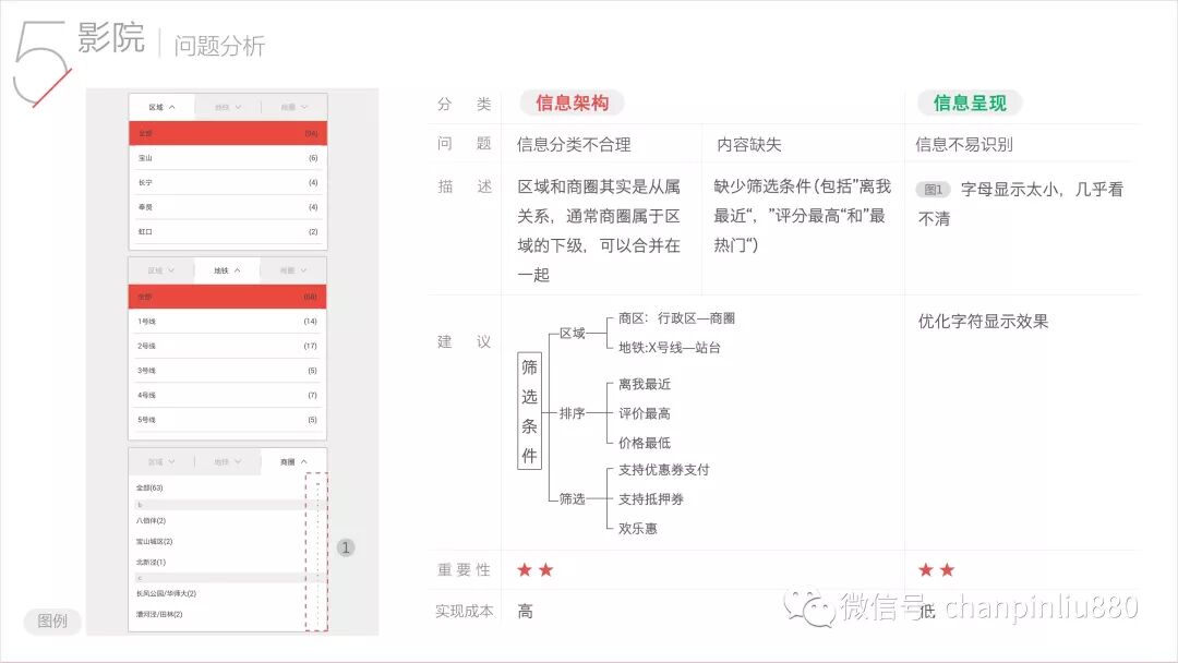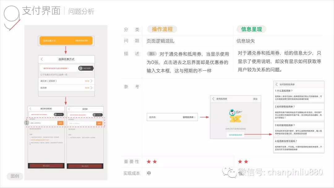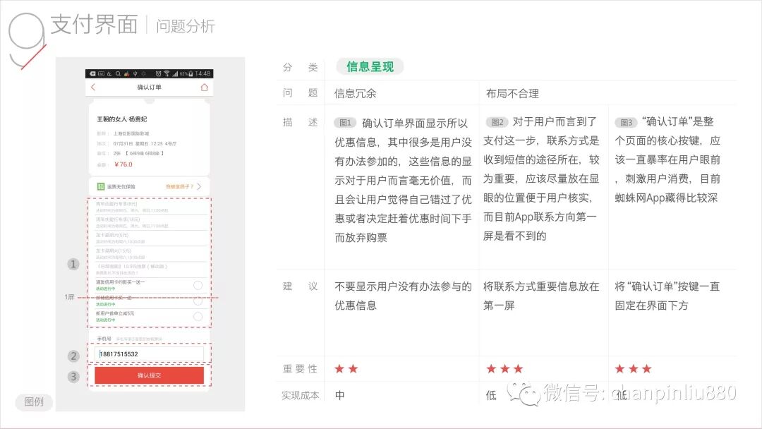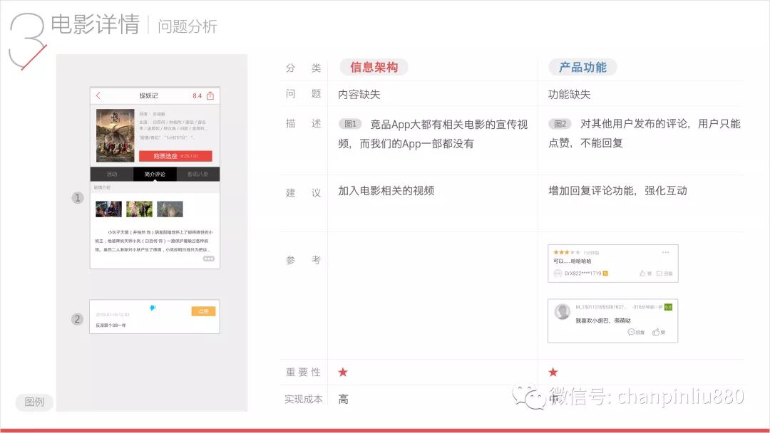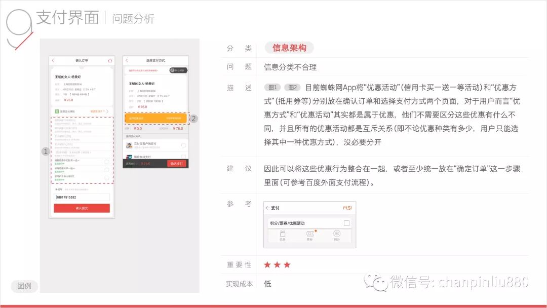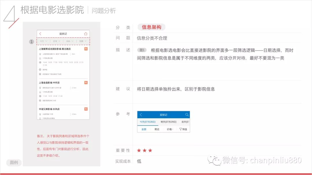 在流程体验过程中,及时发现与记录影响任务的交互和设计问题,如某操作逻辑架构不合理、步骤繁琐、重点功能不突出,不能便捷的完成任务等,对于每条问题,需要根据竞品分析合理提出自己的分析结论——包括对研究对象的分析总结和自己的行动建议,切记把报告写成了流水账。