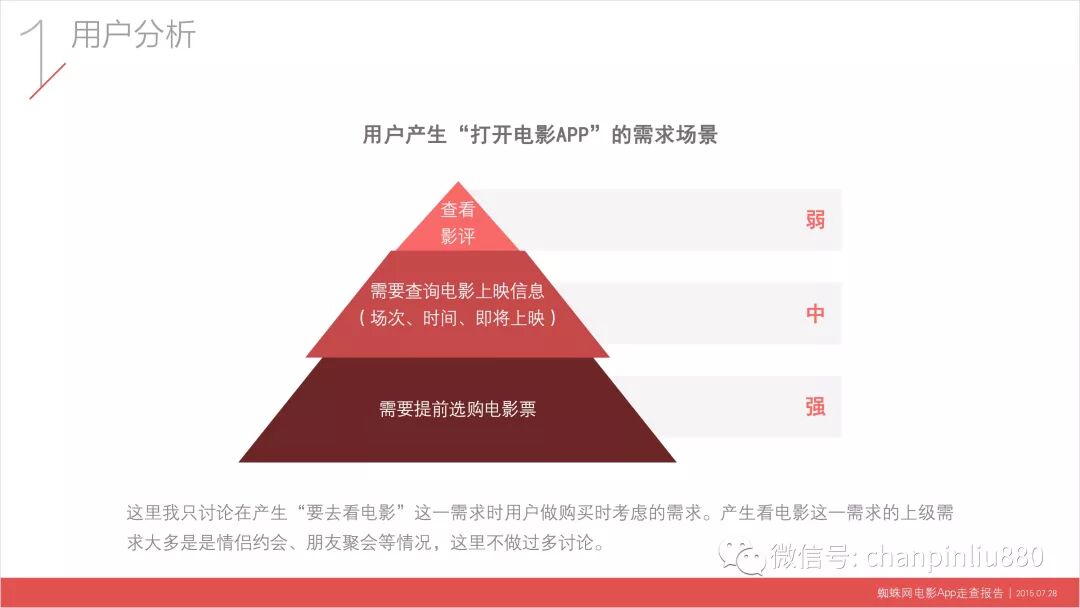 基于我后面需要负责的是蜘蛛网电影票的的UI和UE,因此我更多的是从产品的 UI、交互细节方面入手,宏观层面(如目标用户、商业模式等)不是此次考虑的重点。从这个目的出发,我需要做的就是找到那些交互和视觉设计都做得不错的竞品进行比较分析,取其精华去其糟粕,用以指导我们产品后续的改进。