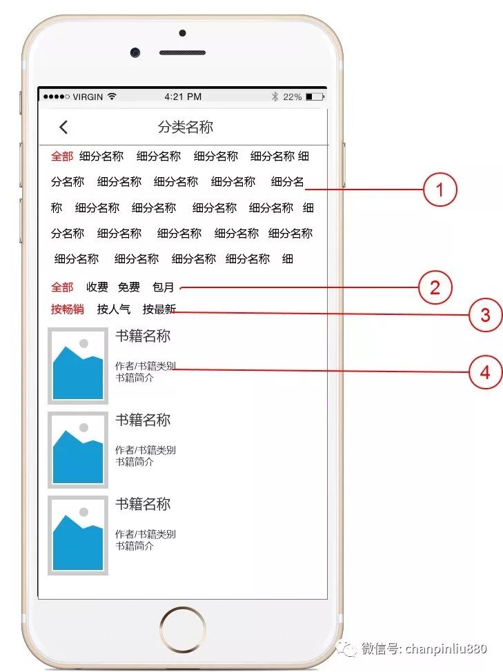 标注3:点击按畅销,按人气,按最新,书籍列表将展示符合要求的书籍,该栏目选项标签每次只能选中一个。选中时字体呈现红色。