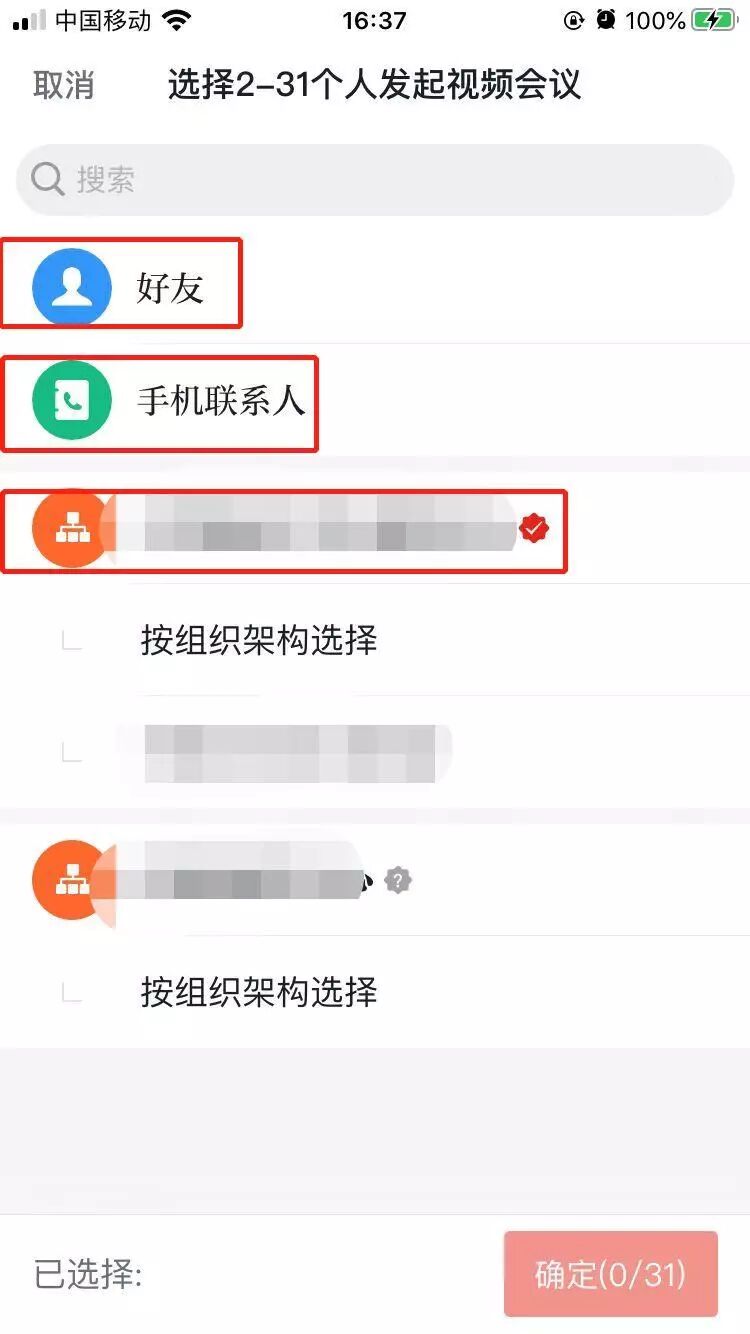 点击"添加会议成员",既可以从”好友“”手机联系人“添加参会成员,也可以从学习组织中添加参会成员;