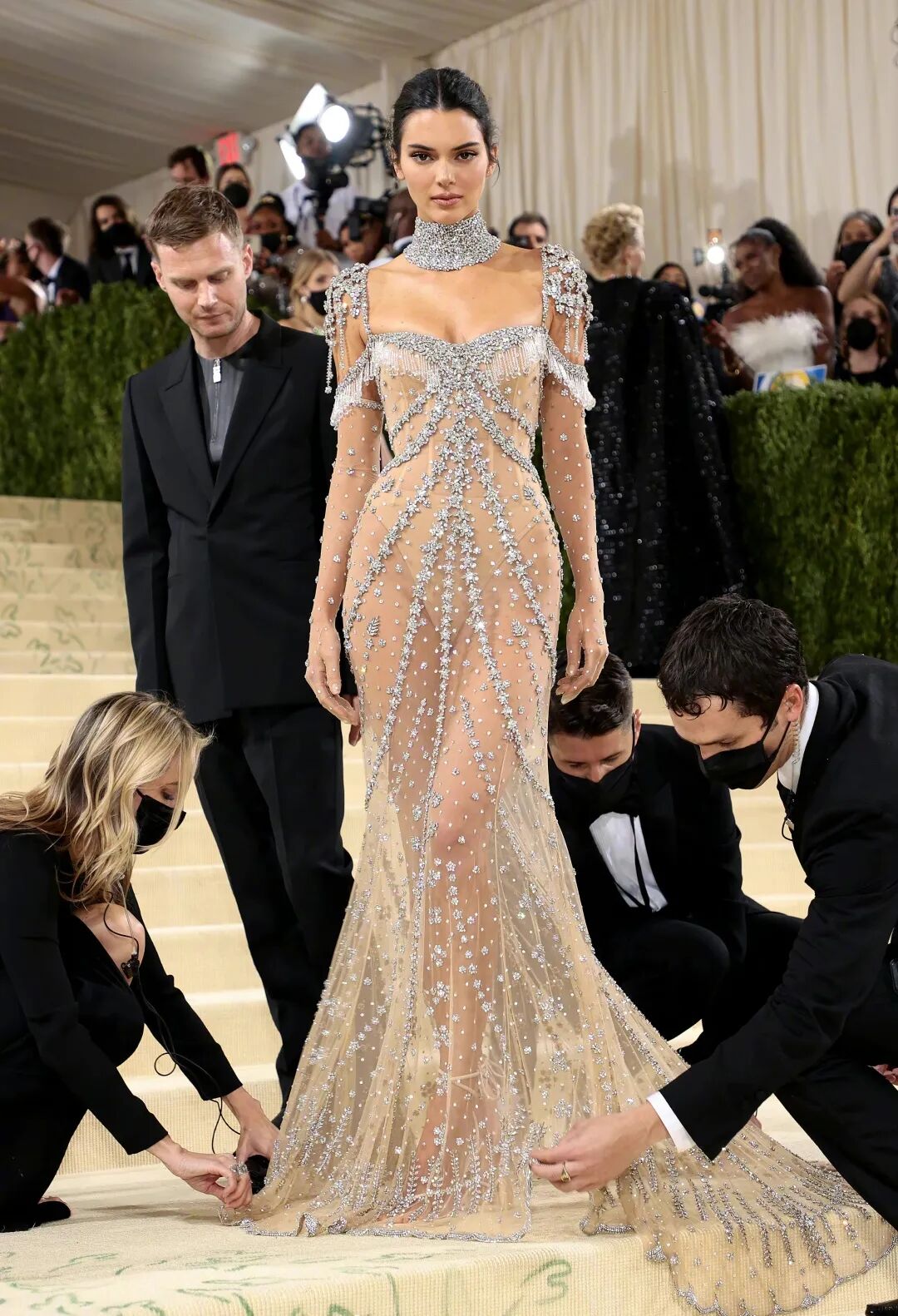 将透视装穿出高级又不失性感的人选里一定有Kendall Jenner的名字。在2021 Met Gala上,肯豆身穿的那一条耀眼动人的Givenchy镶钻透视礼服让她在红毯上大杀四方。