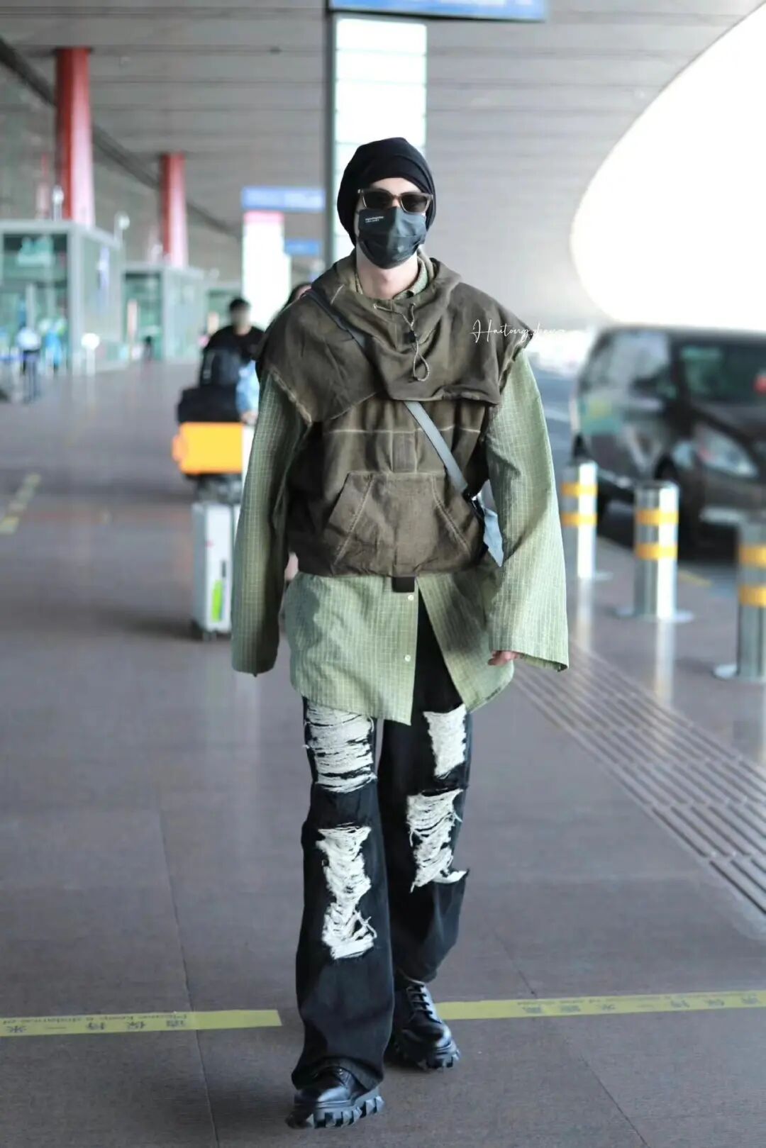 王鹤棣选择浸染效果的连帽工装背心叠穿细格纹衬衫,整体造型机能风十足。如果觉得元素过多很难驾驭,可以尝试将破洞肌理牛仔裤或格纹衬衫换成较为基础的款式会更容易搭配有设计感的背心~