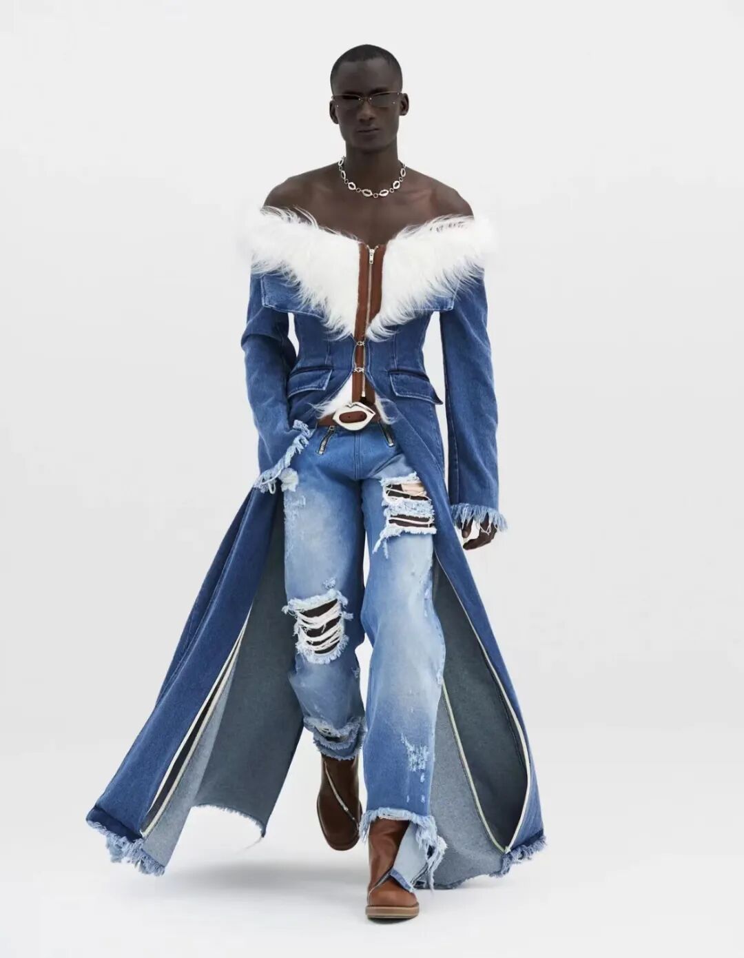今天大火的GmbH2022春夏男装系列里,一字肩上衣成为标志性元素之一,采用一些经典的牛仔面料和浅色系毛绒皮草,为服装增加了更多的时髦潮流的气息。