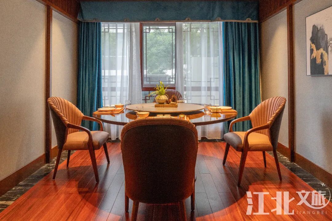 透过红窗可以看到小花园的景致,让人在房间内就能感受江南园林的精致清幽。光线充足,衬出室内典雅明亮,简简单单地依窗拍照就十分出片。