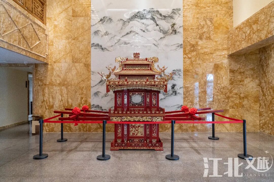 以楠木为原材料,纯手工打造的“千工轿”隆重地摆放在宴会厅外,给中式酒席添彩。
