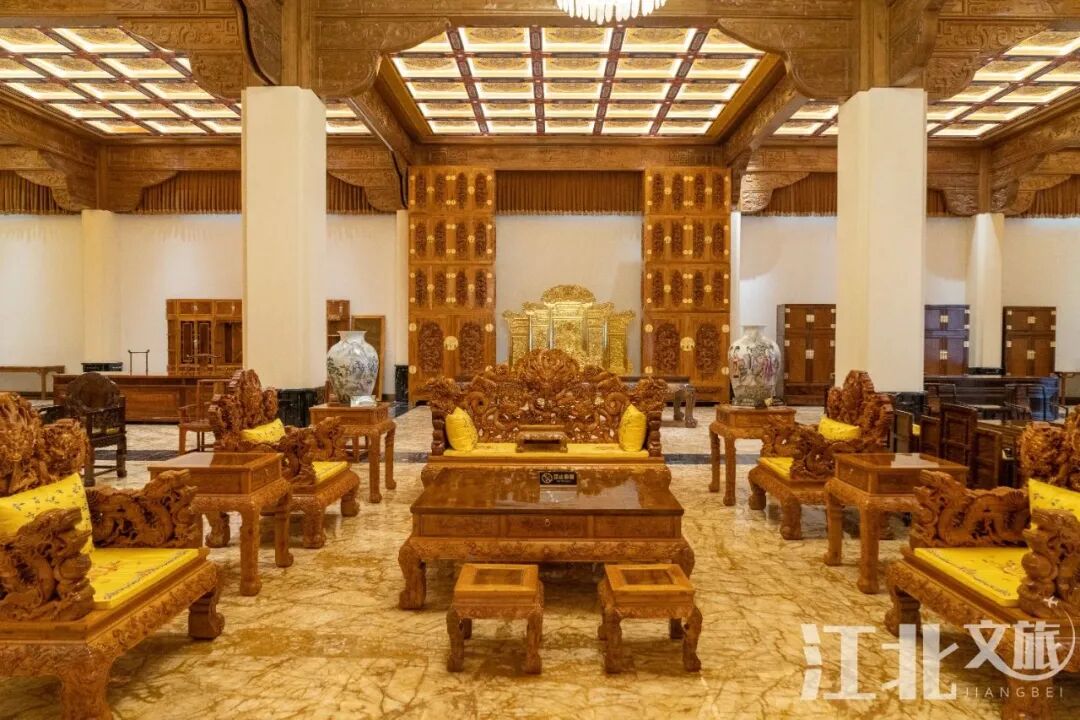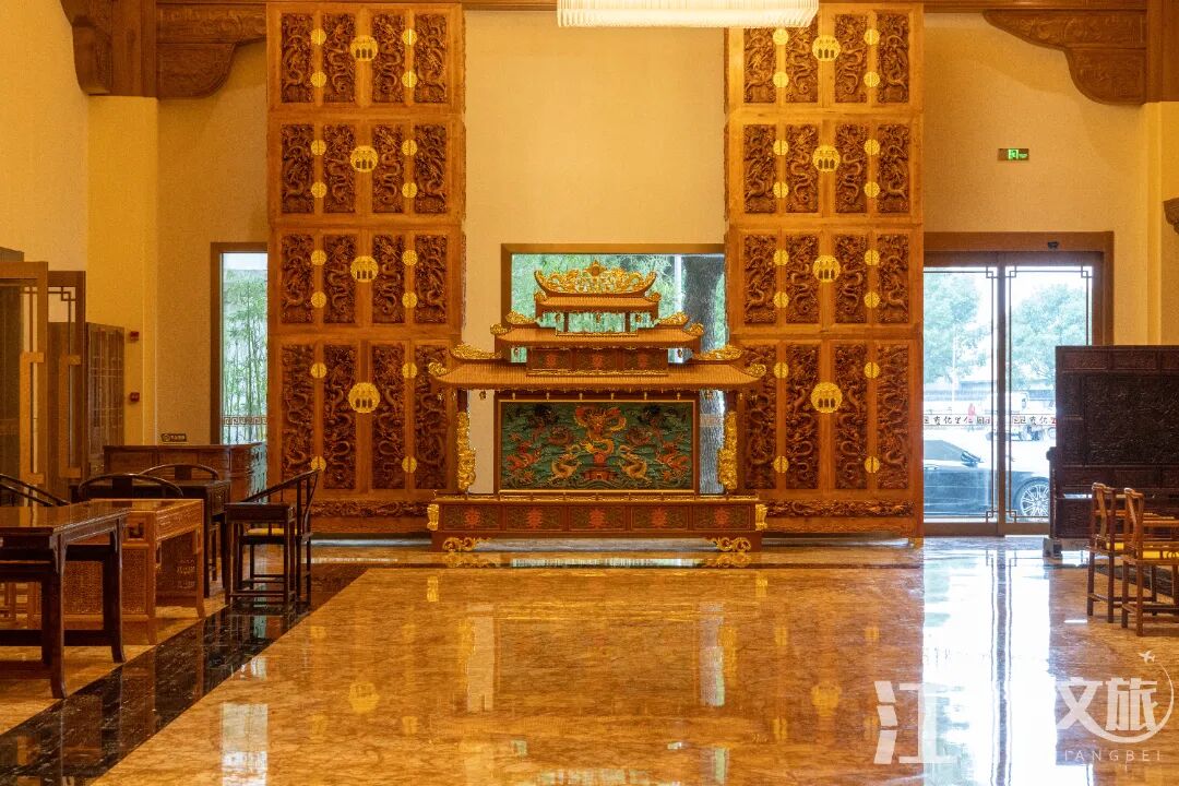 金丝楠木是楠木中的精品,古代主要用于制作皇宫的房梁房柱以及家具、棺木等。比如北京故宫许多房梁都是金丝楠木。大堂内矗立的四个顶箱柜就是仿制故宫太和殿的云龙柜,五米高三米宽,为古代放置皇帝朝服所用。