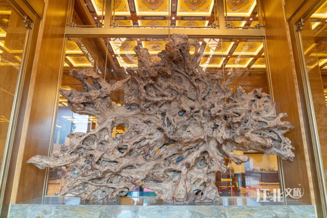 见过这么豪华的酒店前台吗?这个桌案采用整根乌木金丝楠木,在地底至少5000年!千变万化的纹理显得古老又贵气。