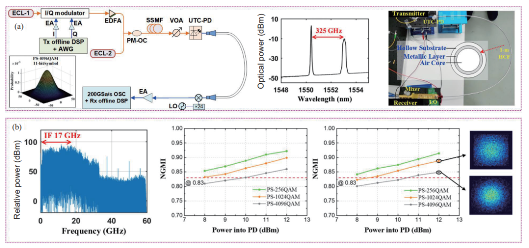 当前已开展光子辅助的太赫兹通信研究,与传统的全电子方法相比,它具有无线载波频率的宽带可调性、超大带宽、少谐波以及与光传输的无缝融合等优点。此外,光通信中先进多维复用技术,如波分复用/偏振复用(WDM/PDM)、高阶矢量调制等,可用来实现100 Gbps及以上的宽带无线传输。然而,在实际传输中,光子辅助的太赫兹系统仍然受到较低的发射功率和较高的大气衰减的限制。在前面的工作中,通过融合光纤传输,一段“光纤-THz-光纤”透明传输系统被演示,在230 GHz太赫兹载频上实现240 Gbps和190 Gbps的线速率,分别传输5米和115米无线距离。这项研究工作采用了超宽带的离子体调制器,能够将太赫兹信号直接映射到光载波上,从而实现光波与太赫兹之间的透明传输。在另一项研究中,330 GHz太赫兹无线链路可以直接与太赫兹光纤有线链路完美对接,成功传输了8 Gbps无压缩高清4K视频。其中使用的太赫兹空心光纤,是由一层薄薄的低折射率膨胀聚四氟乙烯包层包围一个空气芯区域;一个专门设计的光子晶体波导用来有效地耦合太赫兹空心光纤和太赫兹无线链路。在我们前期的工作中,采用2段1.5米长的介质涂层金属空心光纤(DMHF),实现了空分复用的128 Gbps无线传输。这种空心光纤可以有效地传输太赫兹信号,具有低色散、低损耗等优点,为更高频率的无线传输打开了实际工程应用的可能性。在此基础上,我们利用这种太赫兹空心光纤,进一步实验演示了在325 GHz太赫兹载频上传输32 Gbaud的PS-4096QAM信号,实现单通道352 Gbps传输速率,即275.2 Gbps的净速率以及8.6 bit/s/Hz净频谱效率的最高记录。
