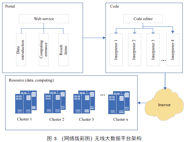 图3展示了一种典型的无线大数据平台架构图, 主要包括门户、代码和资源三大子系统. 其中, 门户子系统主要提供公开数据集的展示(如数据集简介和切片下载)、计算平台入口以及分析结果展示; 代码子系统提供交互式编程和交互式数据分析, 用户可采用各类编程语言在线编写和共享代码, 并调用资源子系统中的数据和计算资源集群进行远程的数据访问和计算; 资源子系统是一个分布式的集群系统, 支持数据分布式存储和跨地域异构计算能力, 从而能够在保持数据独立性的前提下为多方提供处理数据的能力.