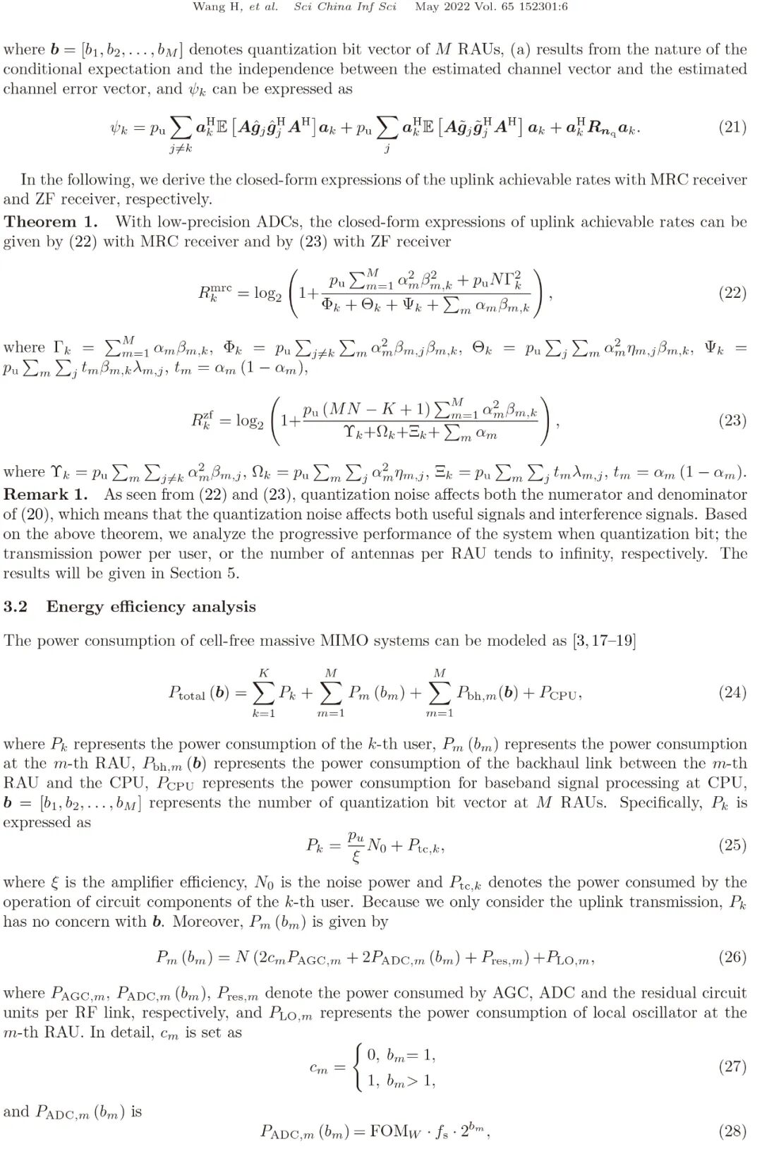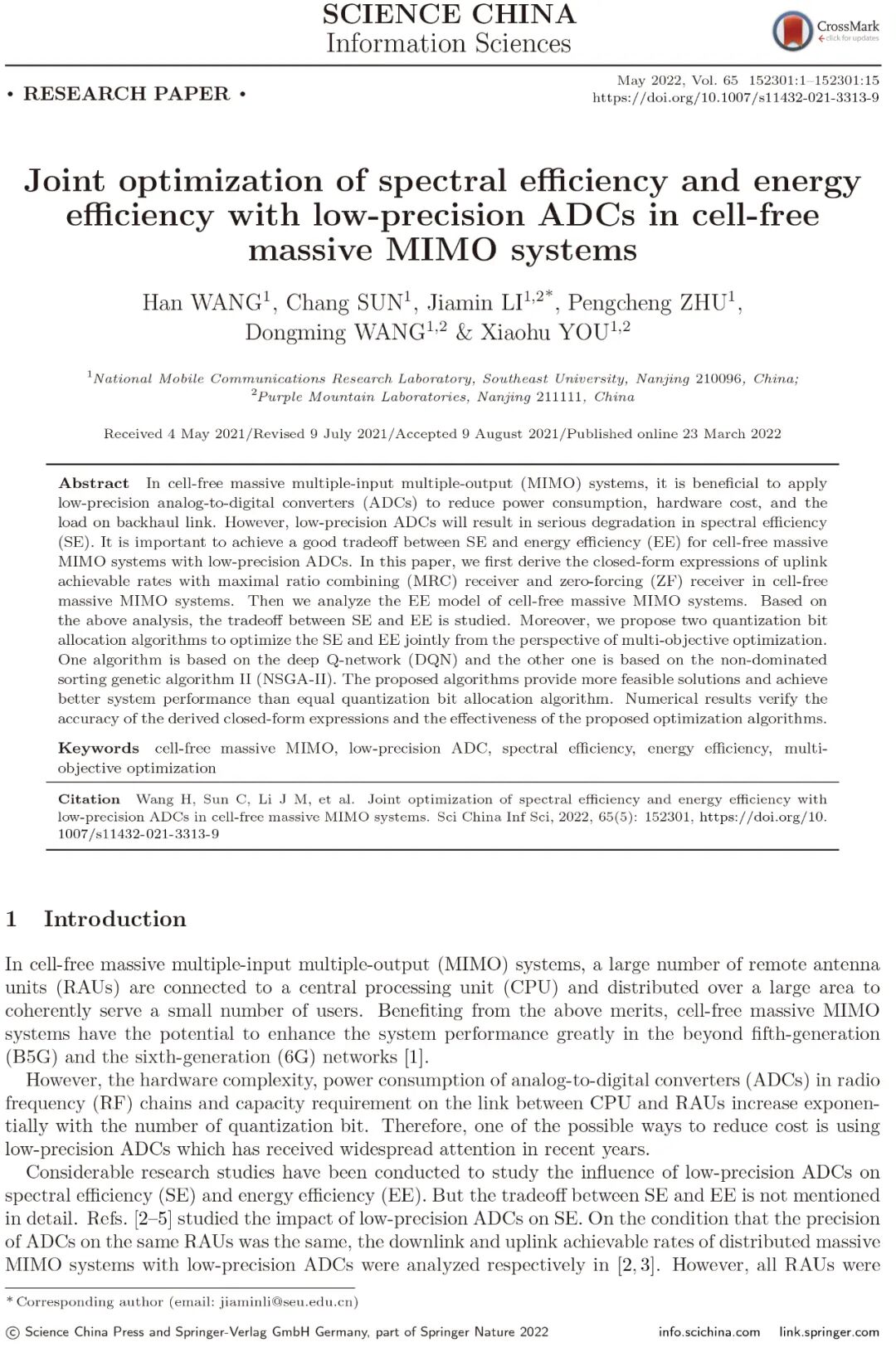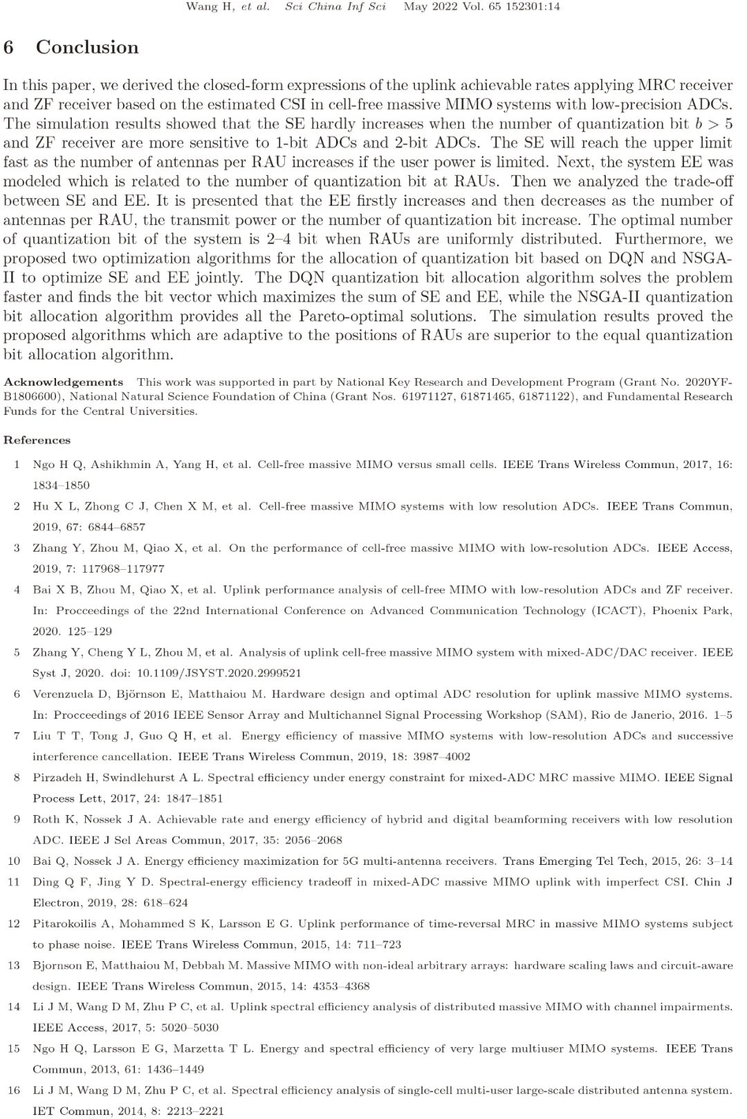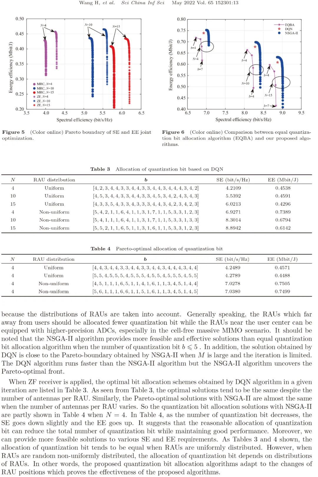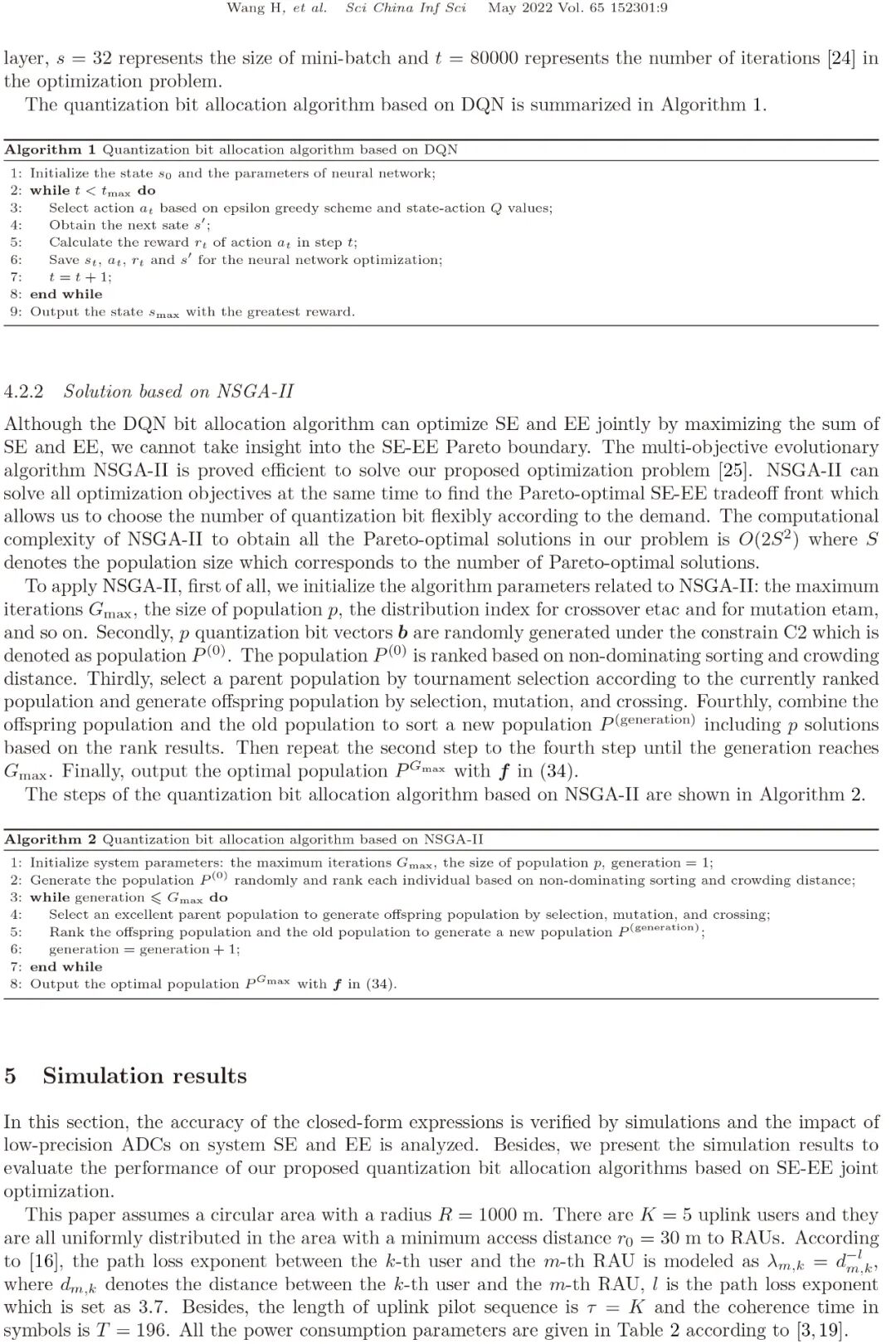在无蜂窝大规模多输入多输出(MIMO)系统中,应用低精度模数转换器(ADC)有利于降低功耗、硬件成本和回程链路负载。但是,低精度ADC会导致频谱效率(SE)严重下降。对于具有低精度ADC的无蜂窝大规模MIMO系统,在频谱效率和能量效率(EE)之间实现良好的折中非常重要。本文首先考虑最大比合并(MRC)接收机和迫零(ZF)接收机,推导了在无蜂窝大规模MIMO系统中考虑低精度ADC时系统SE和EE的闭合表达式。在此基础上,深入研究了系统SE和EE的折中关系。最后,从多目标优化的角度提出了两种量化比特分配算法来联合优化SE和 EE。其中,一种算法是基于Deep Q-Network (DQN),另一种算法是基于非支配排序遗传算法(NSGA-II)。与等量化比特分配算法相比,本文所提出的算法提供了更多可行的解决方案,并实现了更好的系统性能。仿真结果验证了闭合表达式的准确性和所提出的优化算法的有效性。