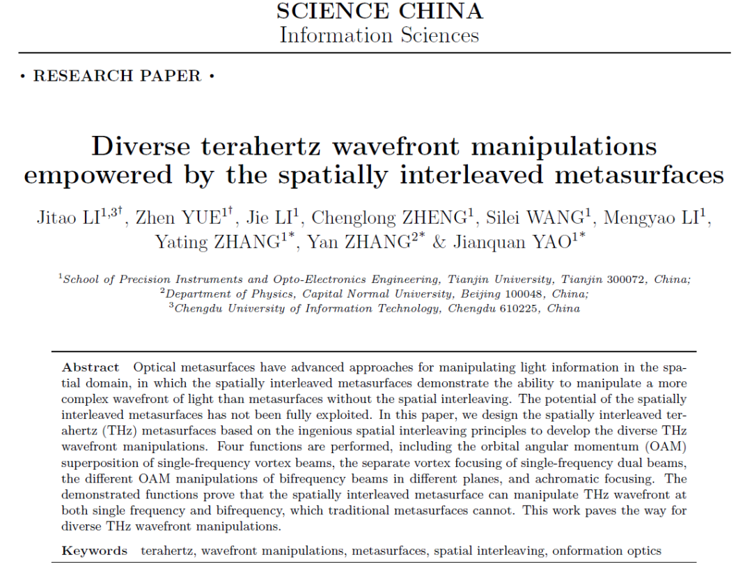 Citation: Jitao LI, Zhen YUE, Jie LI, et al. Diverse terahertz wavefront manipulations empowered by the spatially interleaved metasurfaces. Sci China Inf Sci, 2022, doi: 10.1007/s11432-022-3499-4