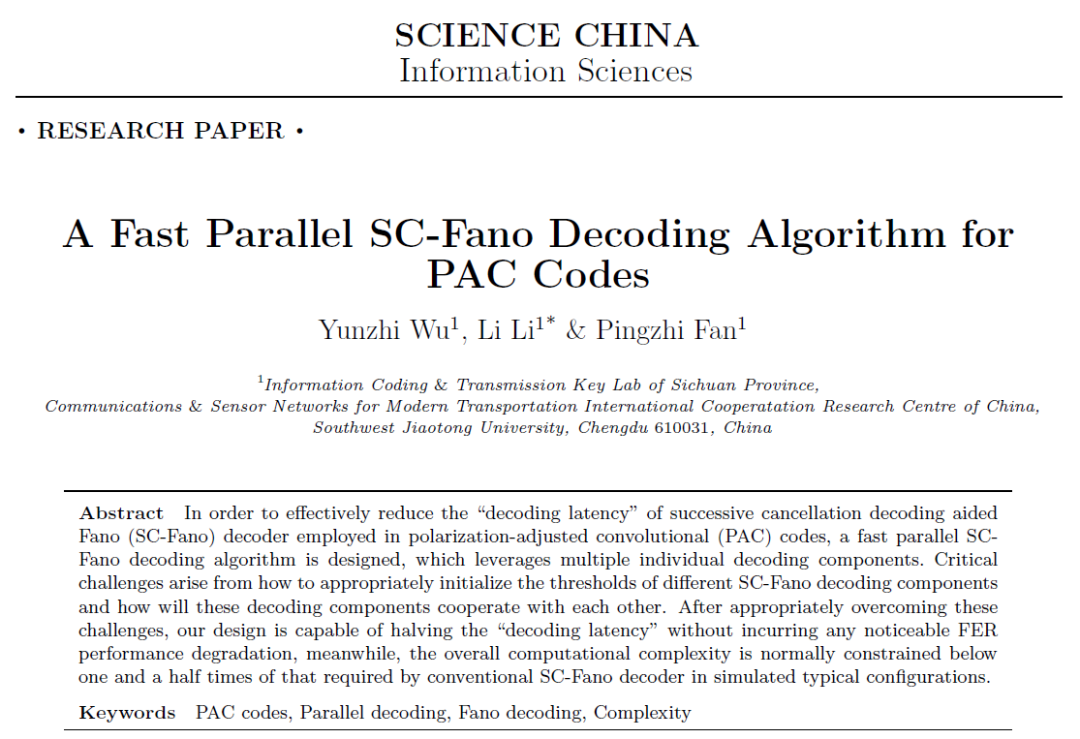 Science China Information Sciences 最新录用了由西南交通大学吴云志博士、李里、范平志教授共同撰写的研究论文“A Fast Parallel SC-Fano Decoding Algorithm for PAC Codes”。
