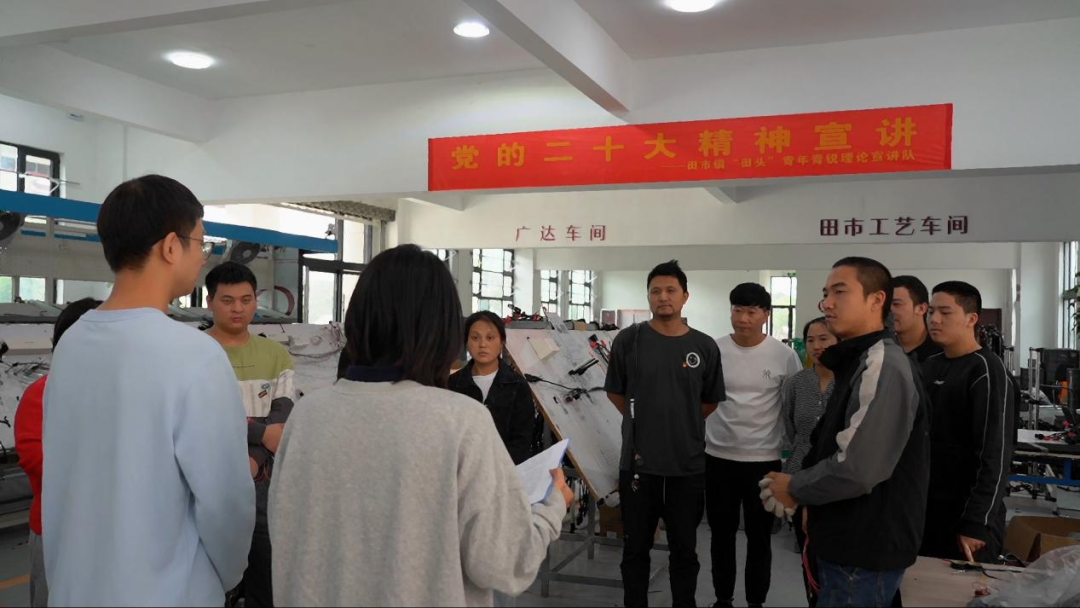 两位00后宣讲队员与车间工人一起,围绕“中国式现代化”“高质量发展”“共同富裕”等党的二十大报告内容,聚焦共富工坊车间工人普遍关心的热点问题,用深入浅出、通俗易懂的平常语言,述说新时代十年的伟大变革和伟大成就,向工人们详细解读党的二十大报告。通过基层宣讲注入青春力量,这一场双向的“流动党课”,引发了大家的同频共振,获得了热烈的掌声。