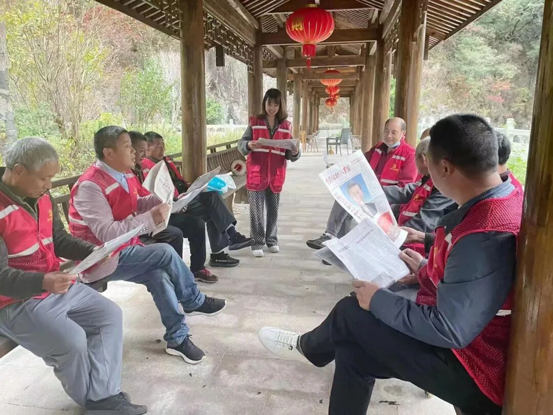党的二十大报告是催人奋进的号角,更是迈进新征程的宏伟蓝图。10月28日,在油溪古村落的廊桥,淡竹乡驻村干部向油溪村的党员干部们宣讲党的二十大精神。
