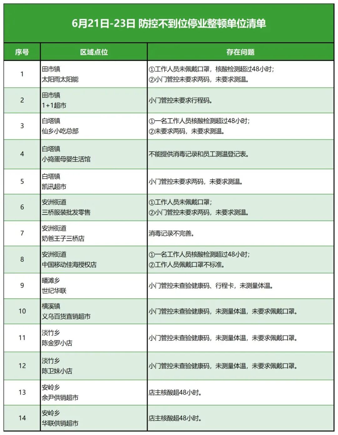 近段时间,我县疫情防控指挥部督查指导组按照“管得更严、放得更开”要求,重点对各乡镇街道商超、餐饮、电信移动联通营业厅、母婴馆育婴馆等公共场所疫情防控措施落实情况开展督查,发现部分点位未测量体温、未查验两码、未要求佩戴口罩、未落实重点人员定期核酸检测、未做好消毒记录等防控措施,予以停业整顿,现将停业整顿的问题点位公告如下: