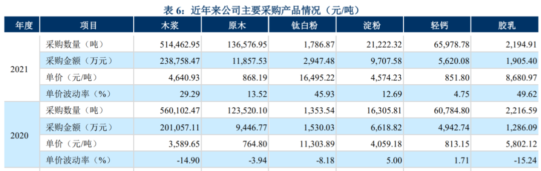 原材料里,主要包括木浆、原木(杨木、杨木皮)、钛白粉、淀粉、轻钙和胶乳等辅助材料,数据显示,木浆占比在80%左右,是最重要的原材料,2021年采购了51万吨。仙鹤股份的木浆包括针叶浆和阔叶浆,基本为进口。根据国家海关数据,2021年全年进口木浆平均价格达到708美元/吨,比2020年度上涨了38%,即196美元/吨。