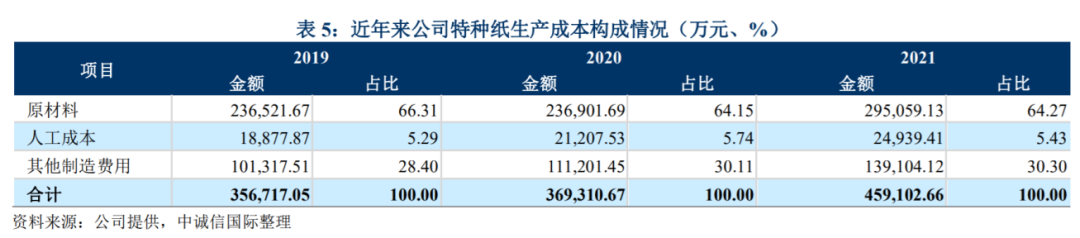 但是不论是哪种纸,木浆都是上游最重要的原材料。根据披露的数据,仙鹤股份原材料占成本的比例差不多是65%,人工成本只占比5%左右,其他制造费用(折旧等)占比30%左右。