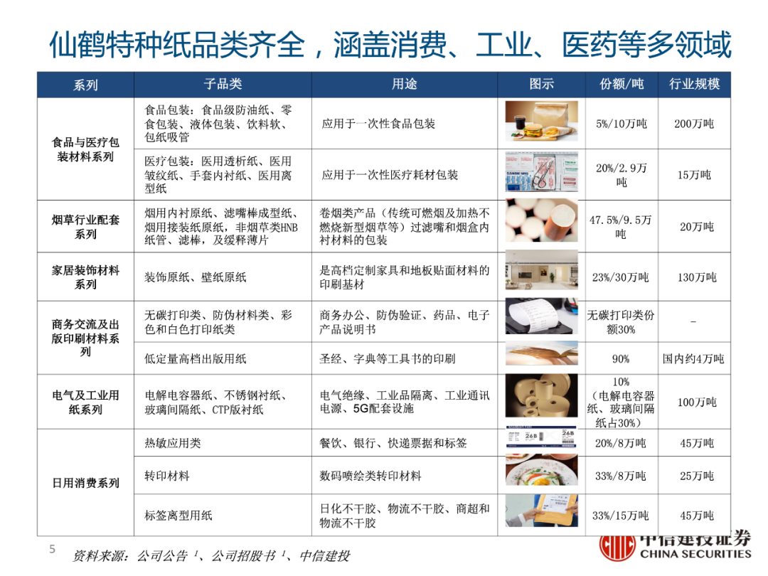 仙鹤股份成立于1997年,地址在浙江省衢州市,以烟草用纸起家,目前产品形成了六大系列60多个品种,包括:1)食品与医疗包装材料系列;2)烟草行业配套系列;3)家居装饰材料系列(合营公司夏王纸业产品);4)商务交流及出版印刷材料系列;5)电气及工业用纸系列;6)日用消费系列等。