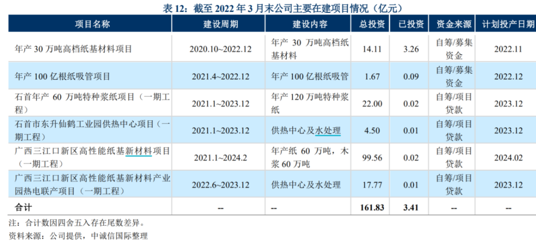 根据在建工程,截至2022年3月末,公司主要在建项目尚需投资158.42亿元,其中,“年产30万吨高档纸基材料项目”和“年产100亿根纸吸管项目”拟使用本期可转债资金13.25亿元。按照公司的投产节奏,预计2022-2025年公司产能分别为120、145、200、240万吨,同时2024年开始,木浆自给率差不多40%。