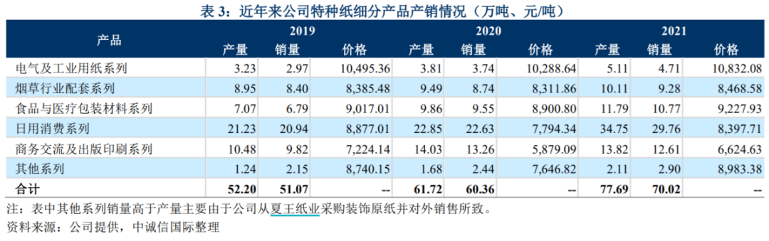 中信建投下面这个表搞得比较清晰,食品系列市场最大,差不多是200万吨,公司产能及份额还比较小,只有5%;电气及工业用纸市场100万吨,公司份额也只有10%,这两块市场还有非常大的提升空间。家居装饰用纸市场空间130万吨,公司市占率约23%,这块业务主要是由公司合营企业夏王纸业经营,业绩非常好,2021年净利润高达5.2亿元。