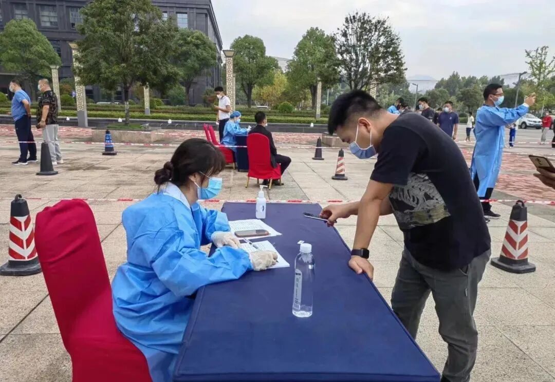 新蒲新区社事局组织20名党员干部到新蒲街道配合开展核酸检测工作。