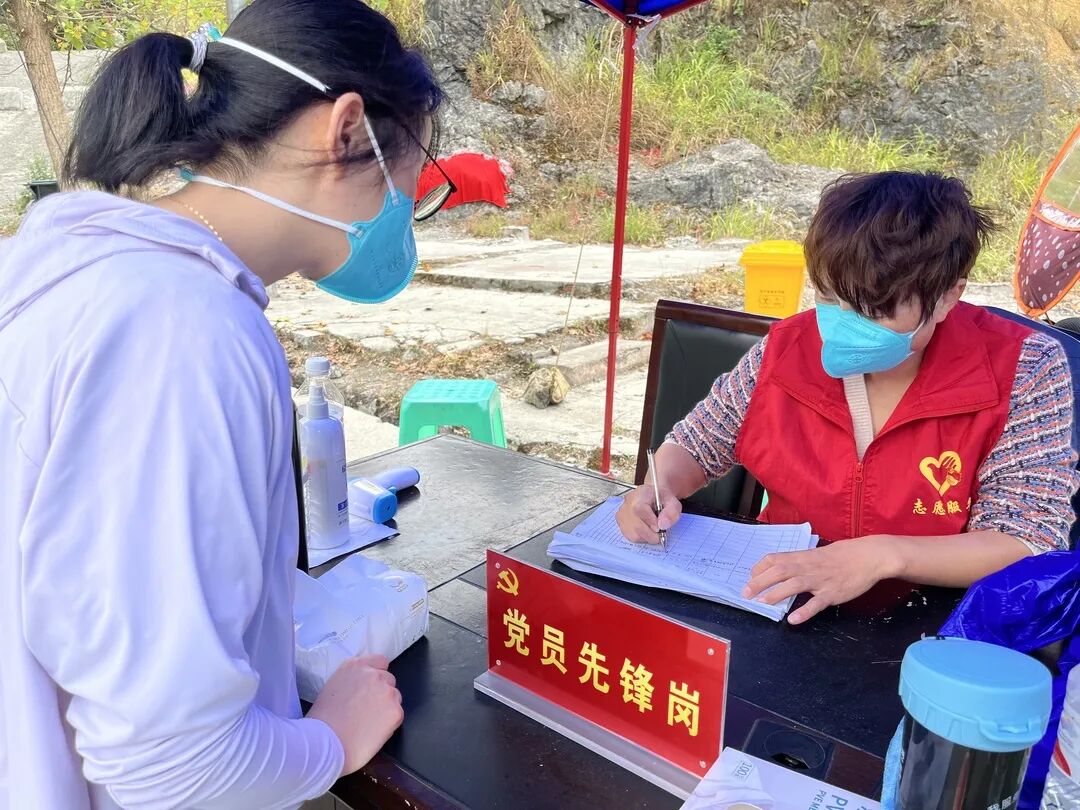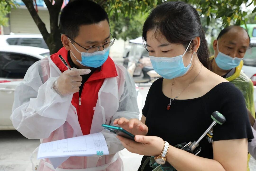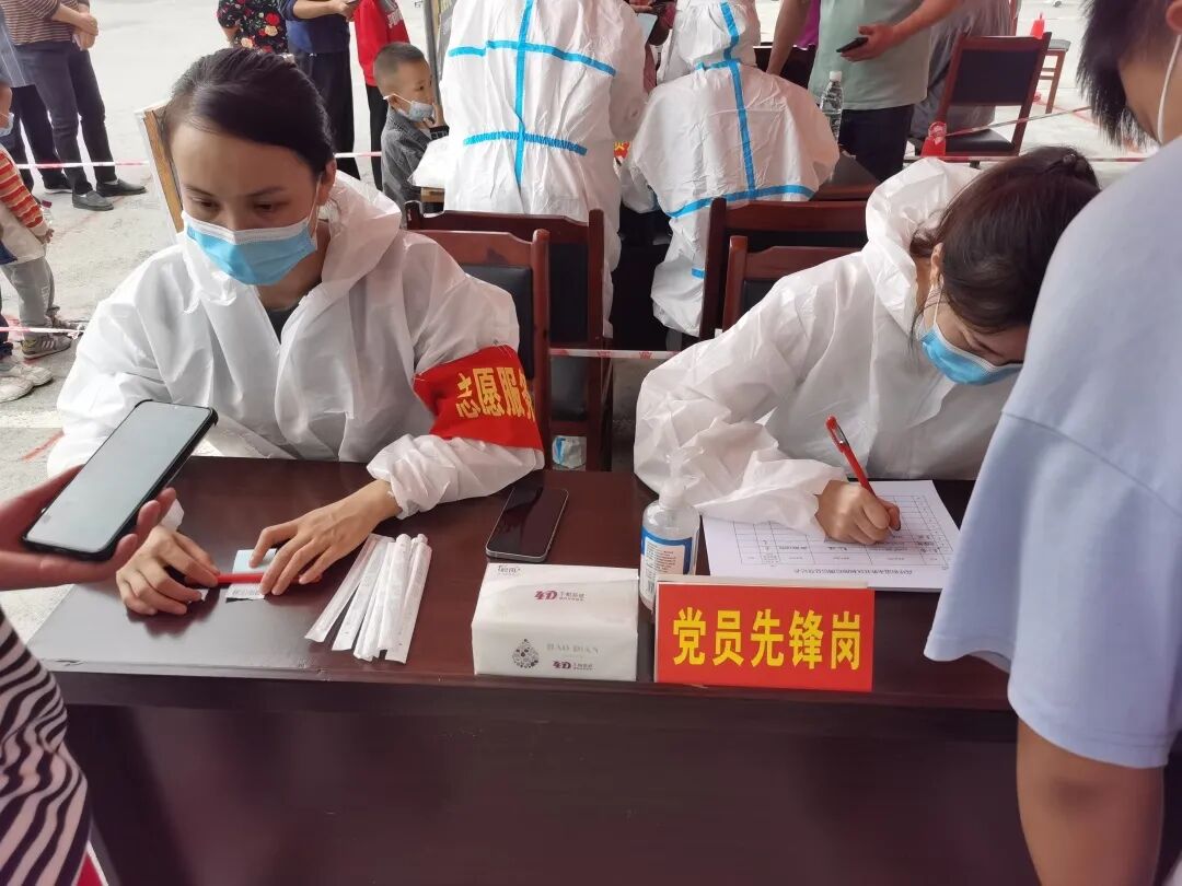 新蒲新区博德源幼儿园发动居家静默管理的教职工积极参加社区疫情防控志愿服务,图为该园教师正在和平社区开展核酸检测登记工作。