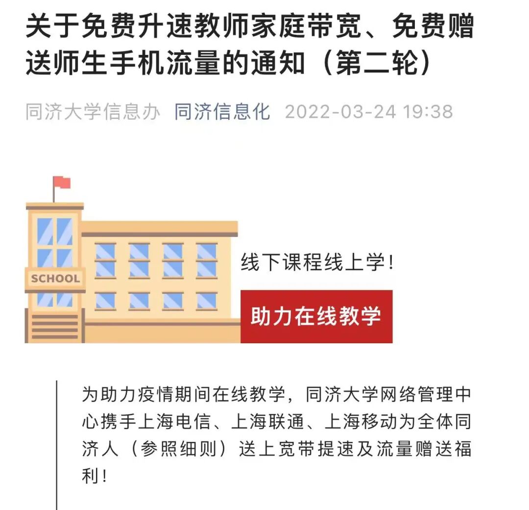 制定一系列工作指南,开展常态化师生技能培训;开通“TJ 线上教学技术支持群”和热线电话,24小时在线提供技术支持;联系三大运营商提供教师家庭带宽免费升速、师生手机流量免费赠送等福利,解决师生线上教学的网络需求。