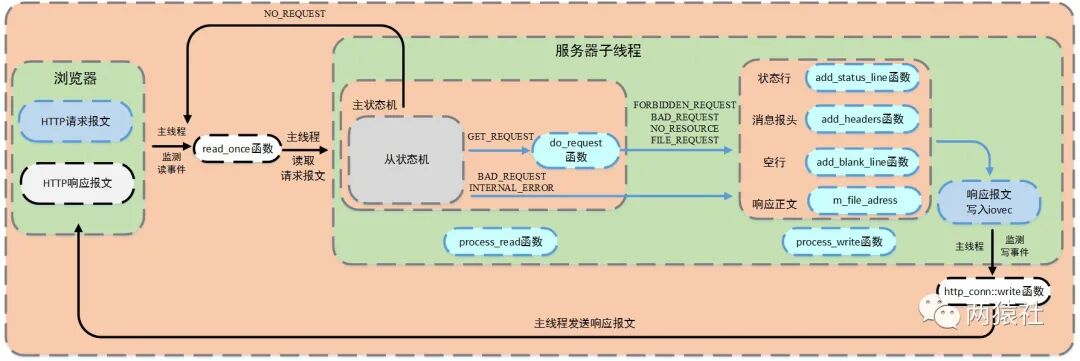其中,服务器子线程完成报文的解析与响应;主线程监测读写事件,调用read_once和http_conn::write完成数据的读取与发送。