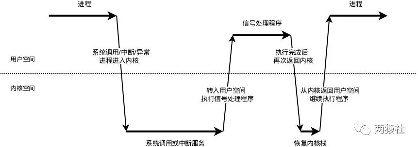 Linux下的信号采用的异步处理机制,信号处理函数和当前进程是两条不同的执行路线。具体的,当进程收到信号时,操作系统会中断进程当前的正常流程,转而进入信号处理函数执行操作,完成后再返回中断的地方继续执行。
