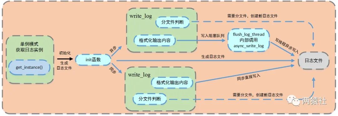 通过局部变量的懒汉单例模式创建日志实例,对其进行初始化生成日志文件后,格式化输出内容,并根据不同的写入方式,完成对应逻辑,写入日志文件。