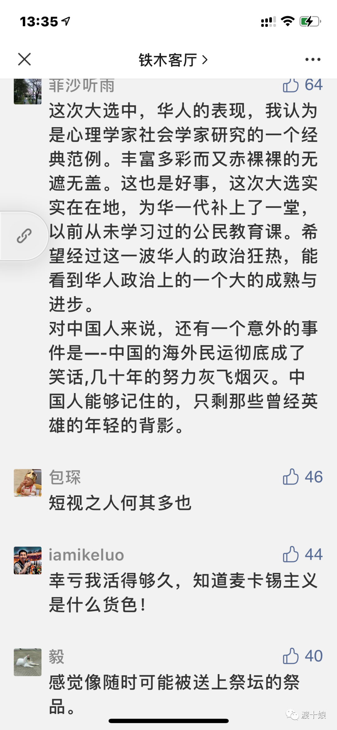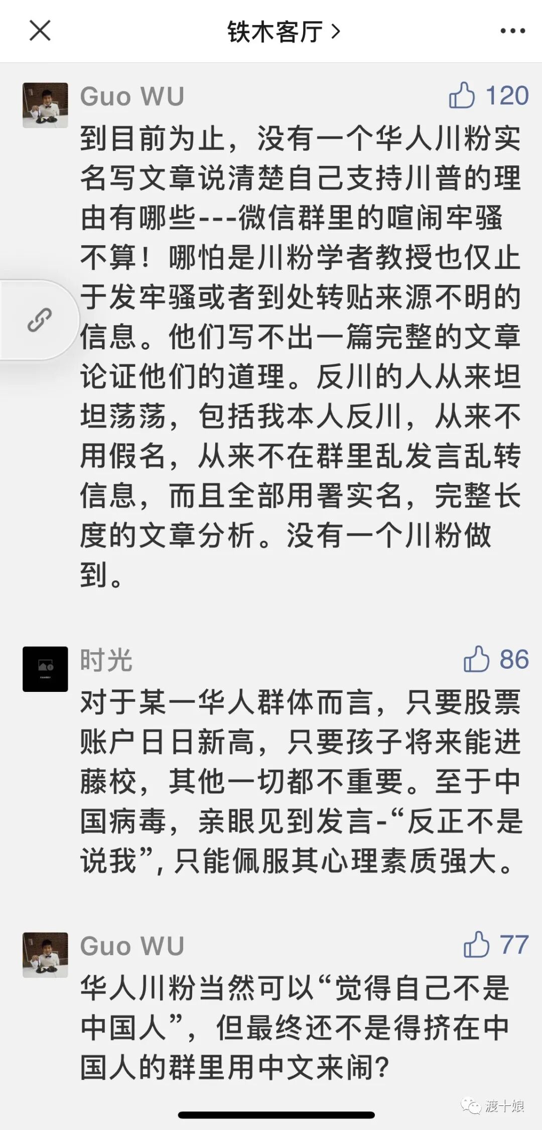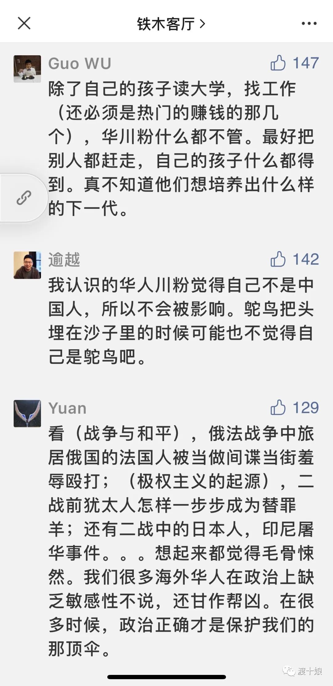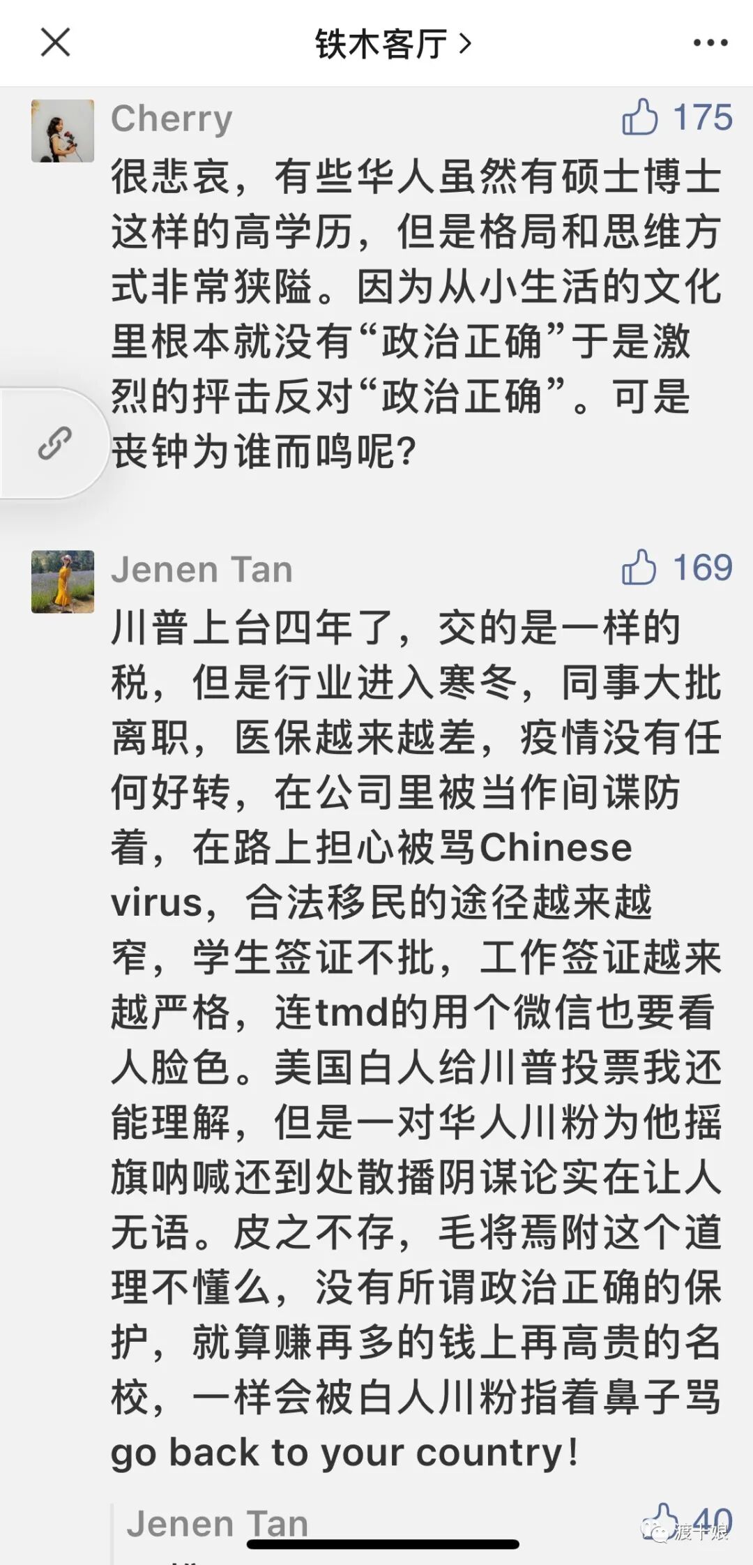 川普一个人的力量是有限的. 但他的忠诚的内阁,就已经力量大了很多. 再到川粉,力量又平添几千万人. 再到普通的各行各业的民众,他们也许都是好人,都是善良的人,但是人之常情就是普通的人也会避险- 而当华裔只因为皮肤就自带“风险”之时,这就不知不觉的在各行各业的竞争中,增加了竞争的成本和门槛.