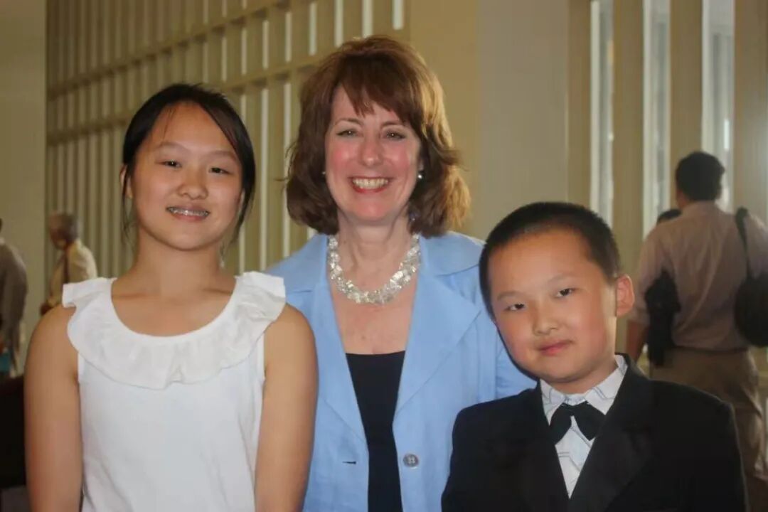 (图三。2011年摄。女儿和儿子与钢琴老师Mary在演出后合影。)