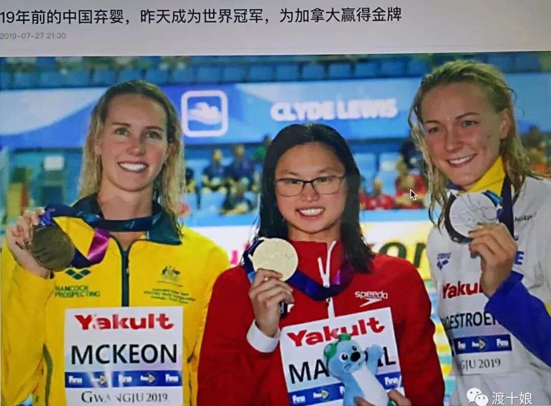 去年7月,在韩国举行的世锦赛女子100米蝶泳决赛中,这位名叫玛姬•麦克尼尔(Maggie MacNeil),来自美国密西根大学游泳队的华裔女孩打破世界纪录,拿下了游泳世锦赛金牌。她在19年前,被一个加拿大家庭从中国收养。