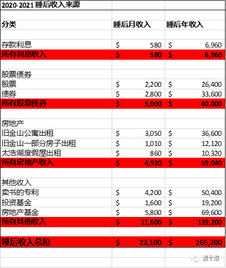 没有工作还想”有钱“就需要有睡后收入(passive income),有几套房子出租,有基金每月有回报等等,看下图的参考标准。