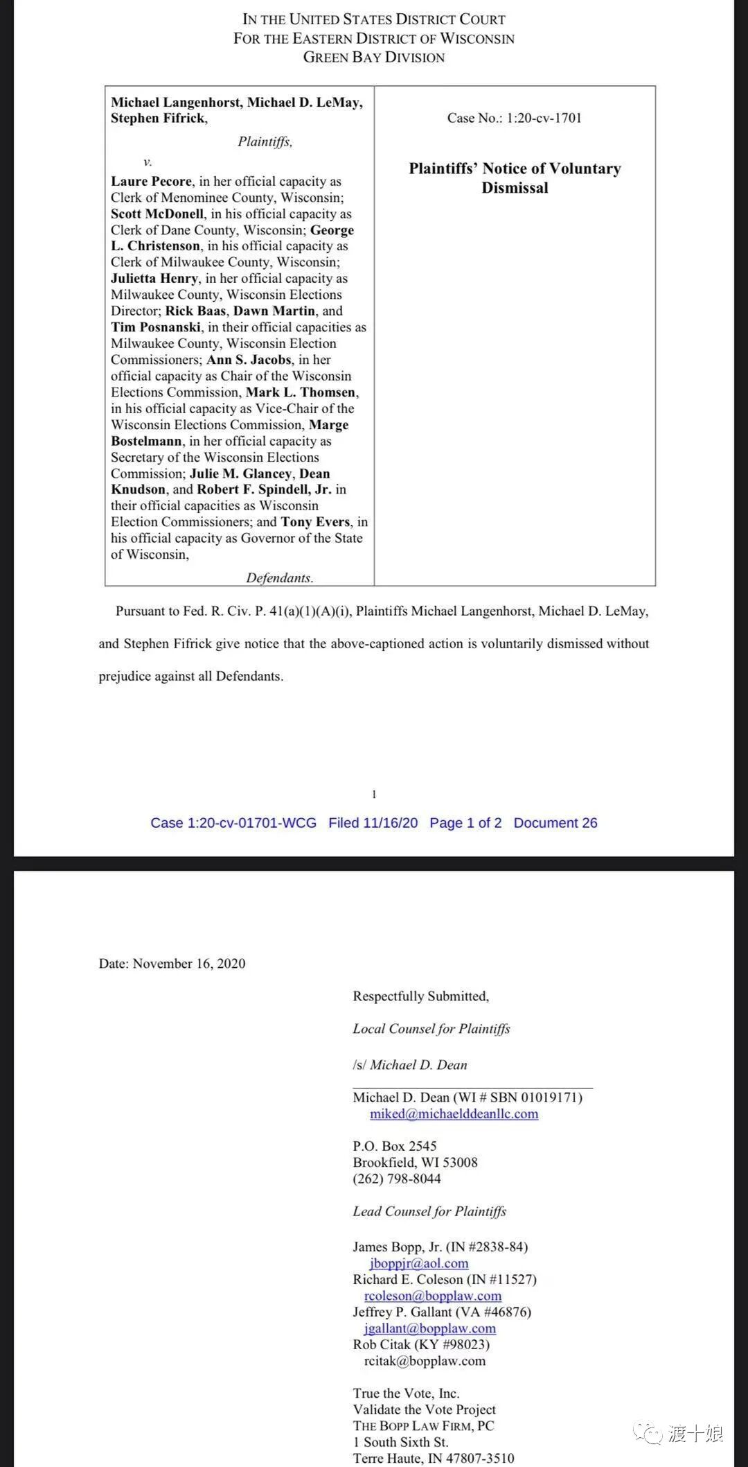 周一上午,首先传来威斯康星法院的消息:川普阻碍州务卿核准选举结果的官司因为没有证据难以为继,律师主动撤诉。威斯康星选举结果出来后,川普落后20000多票,对外界说将要求威斯康星州政府重新数票。按照威斯康星州法律,重新数票费用由川普承担,费用$790万。到今天川普还没有交,估计已经放弃。
